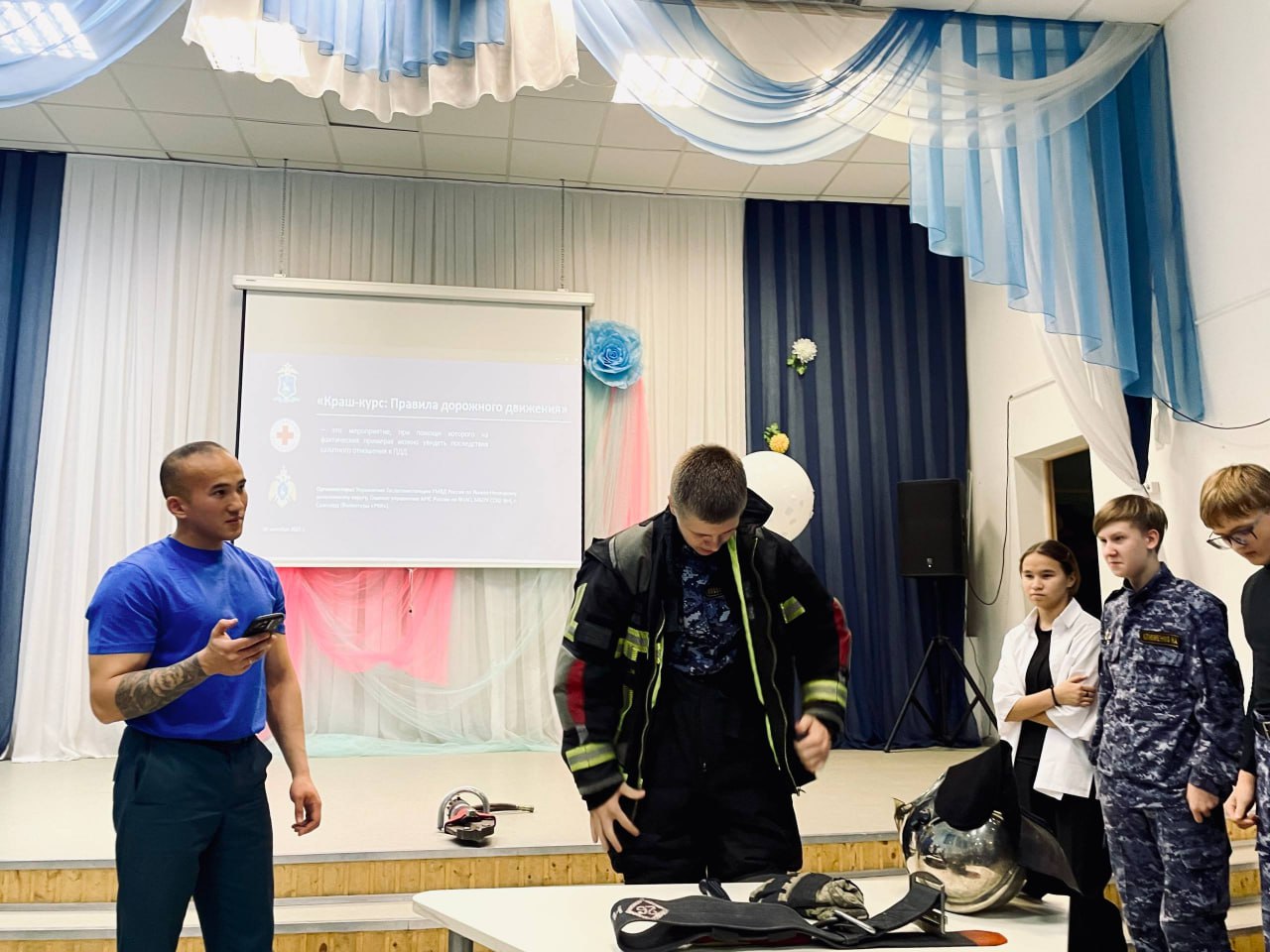 Помощник начальника караула первой пожарно-спасательной части города Салехарда старший сержант внутренней службы Рустам Ахунов и пожарный первой пожарно-спасательной части города Салехарда сержант внутренней службы Максим Кожевин, рассказали о работе МЧС на месте ДТП. Школьникам было предложено выполнить норматив по надеванию боевой одежды и снаряжения. После чего видеоролик наглядно проиллюстрировал процесс спасательных работ: извлечение пострадавших из поврежденных автомобилей, оказание первой помощи и тушение возгораний. Рустам Ахунов подчеркнул важность быстрого реагирования и профессионализма спасателей, а также необходимость соблюдения ПДД для минимизации риска дорожно-транспортных происшествий.