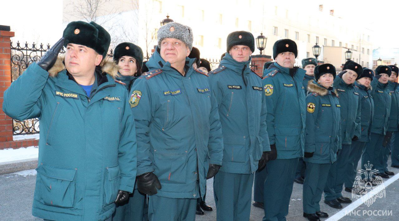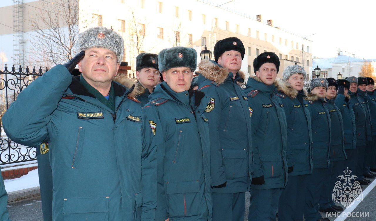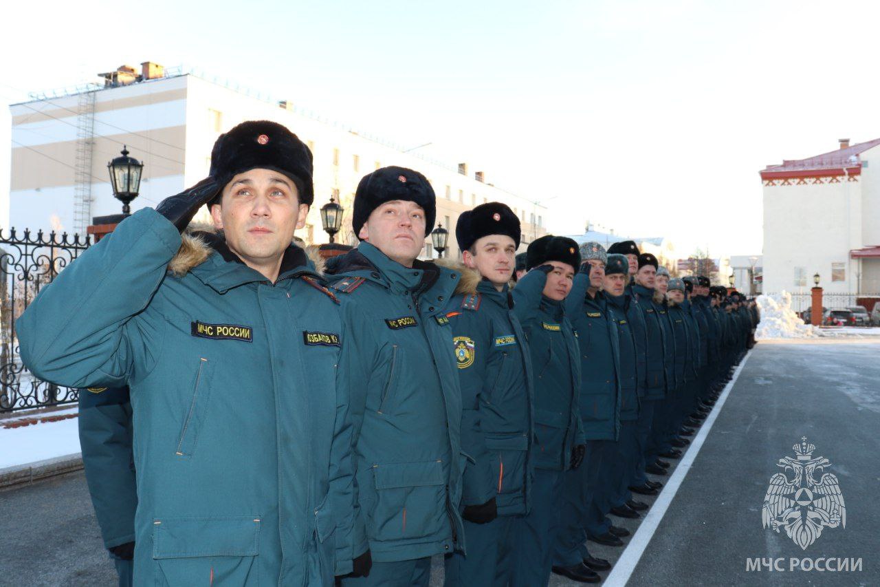 Новая рабочая неделя у ямальских спасателей началась традиционно с построения под Гимн Российской Федерации и поднятия флагов России, МЧС России и Ямала.