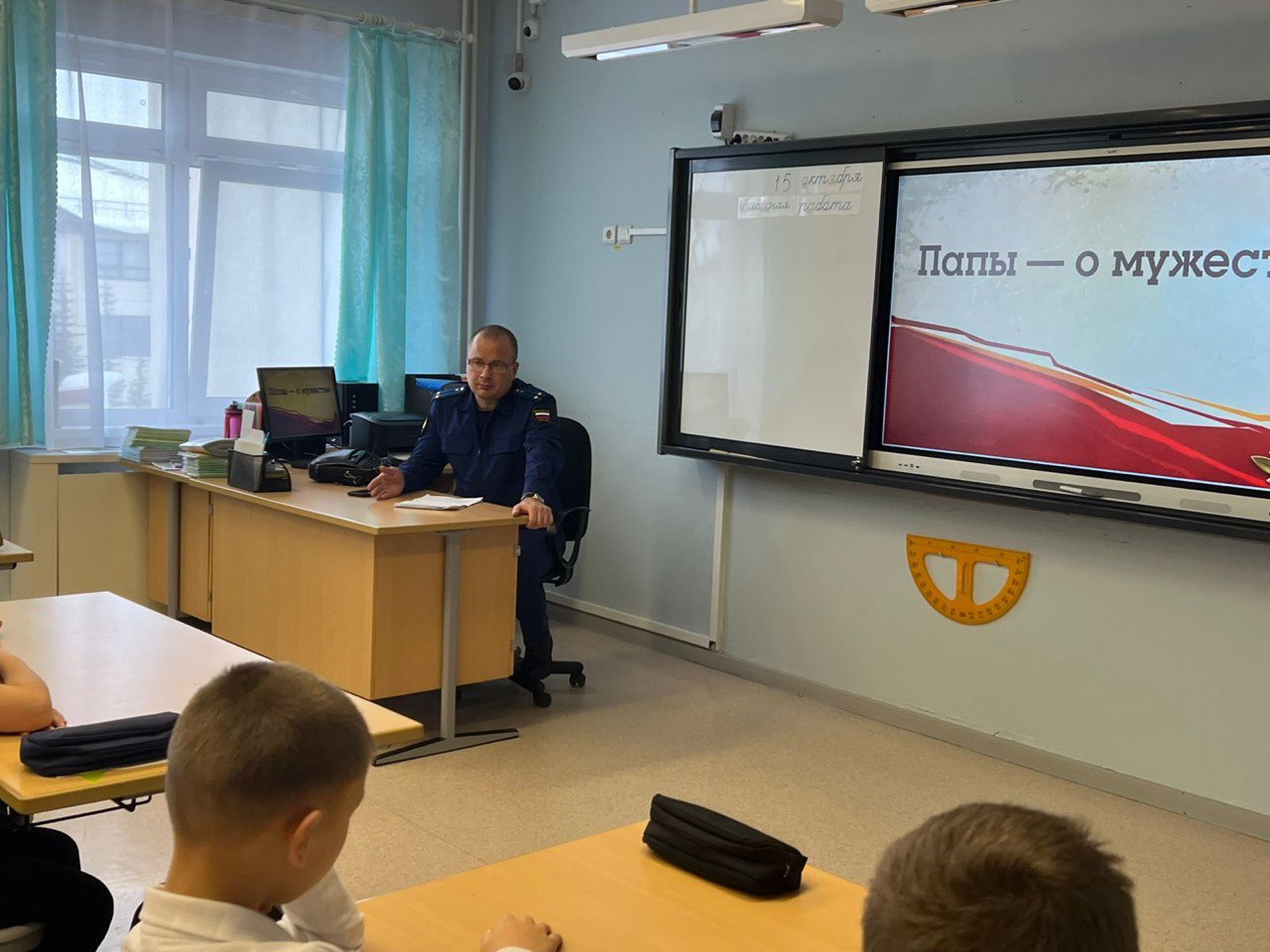 В преддверии Дня отца в России заместитель прокурора Салехарда Алексей Кугаевский провел открытый урок в Средней общеобразовательной школе № 1 имени Героя Советского Союза И. В. Королькова на тему законопослушного поведения в обществе.