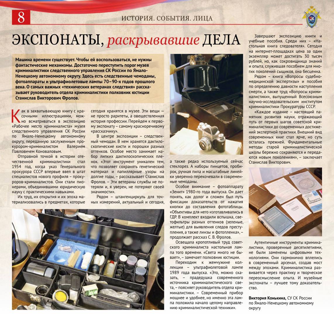 В новом выпуске ведомственной газеты размещена статья под названием «Экспонаты, раскрывавшие дела», подготовленная совместно с руководителем отдела криминалистики следственного управления СК России по Ямало-Ненецкому автономному округу Станиславом Викторовичем Фроловым.