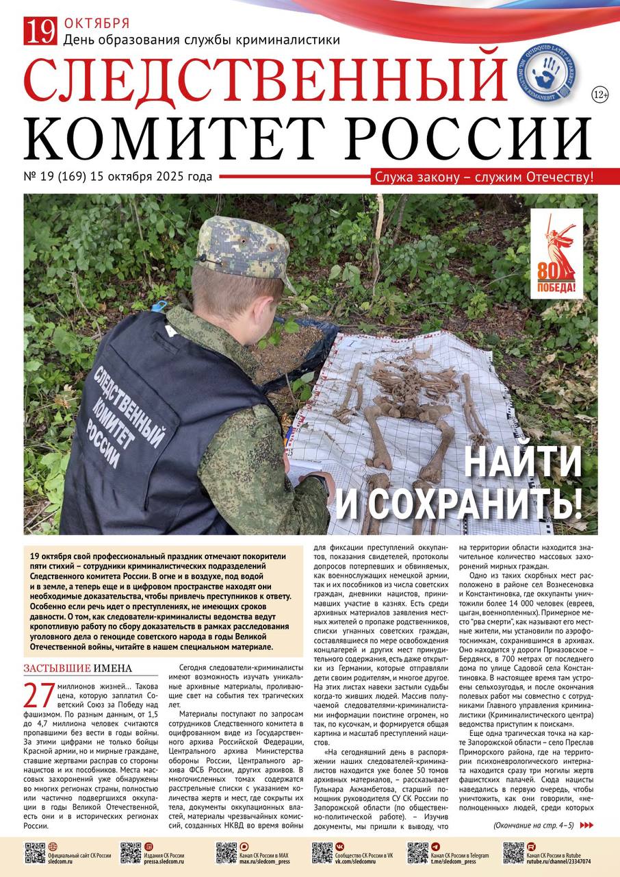 В день празднования 71-ой годовщины образования криминалистической службы, региональное следственное управление знакомит своих подписчиков с очередным выпуском газеты Следственного комитета Российской Федерации № 19 (169) от 15 октября 2025 года.
