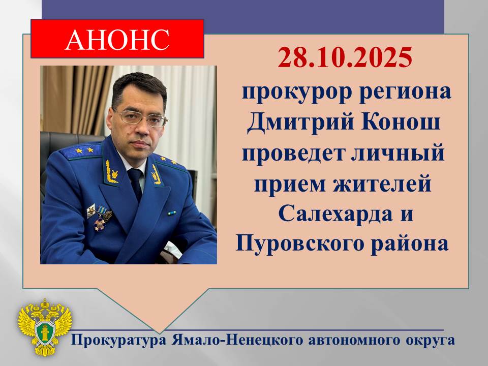 Прокурор Ямало-Ненецкого автономного округа Дмитрий Конош 28.10.2025 в режиме видеоконференцсвязи проведет личный прием жителей Салехарда и Пуровского района.