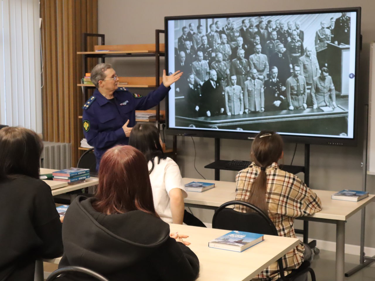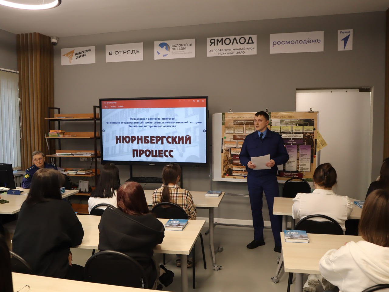 Помощником прокурора Ямало-Ненецкого автономного округа по надзору за исполнением законов о федеральной безопасности, межнациональных отношениях, противодействии экстремизму и терроризму Иваном Смычеком и заместителем председателя Совета Региональной общественной организации ветеранов и пенсионеров прокуратуры автономного округа Андреем Дробининым проведена встреча со студентами ГБПОУ ЯНАО «Ямальский многопрофильный колледж», посвященная 80-летию начала работы Нюрнбергского трибунала.