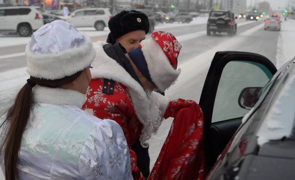 Автоинспекторы, перевоплотившись в Деда Мороза и Снегурочку, несли службу на центральных улицах города.