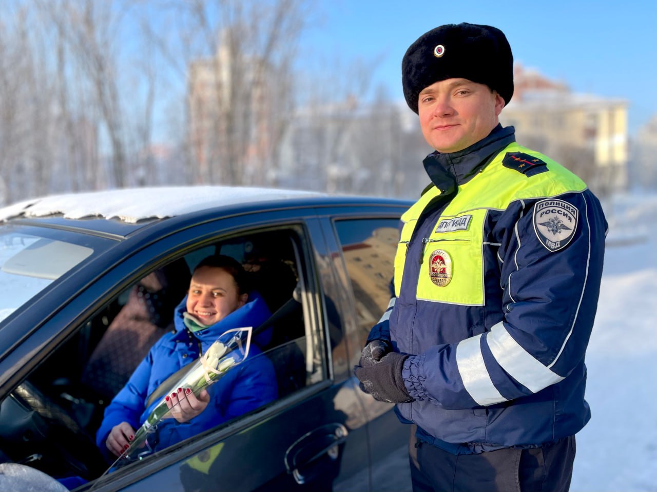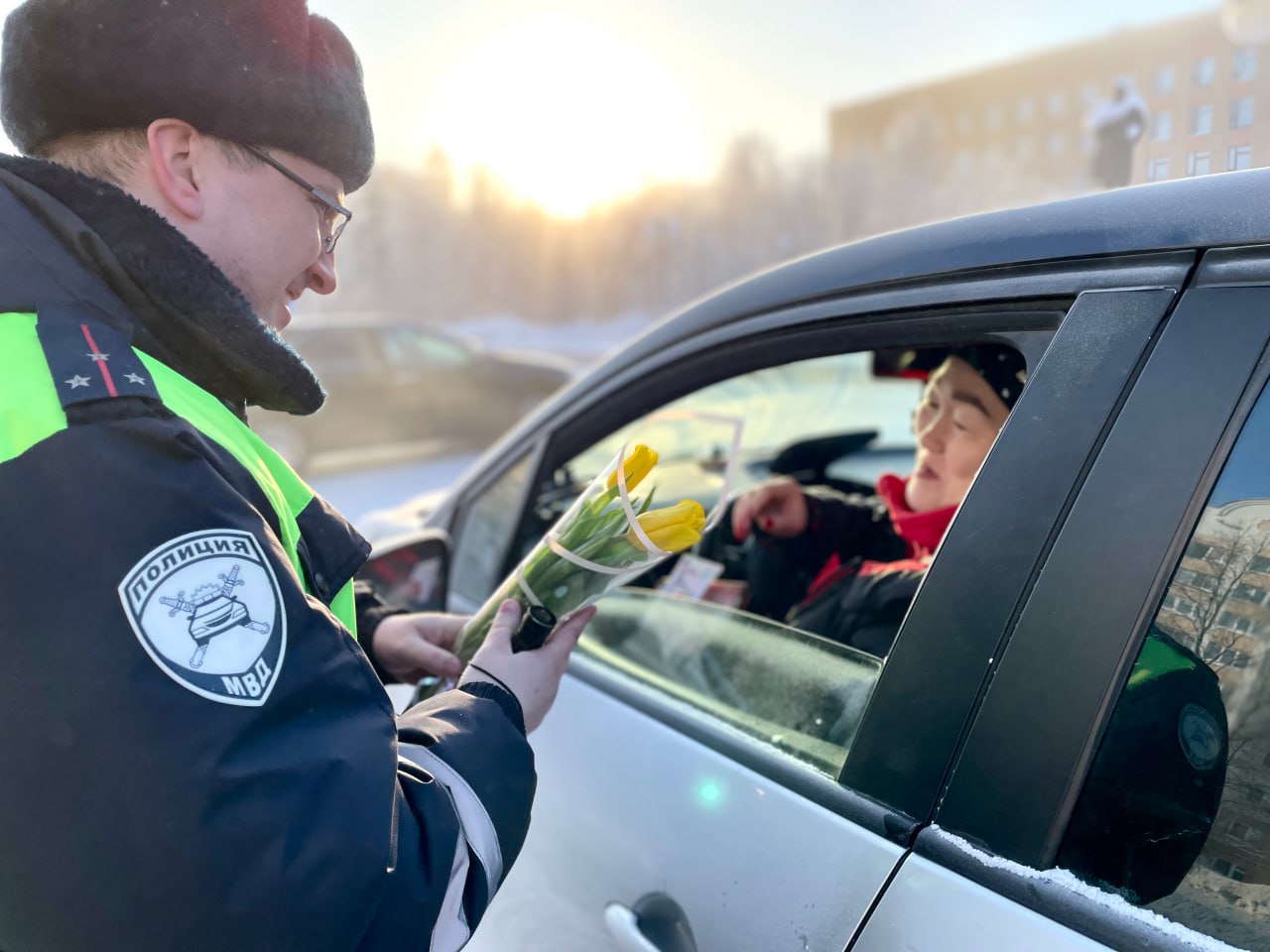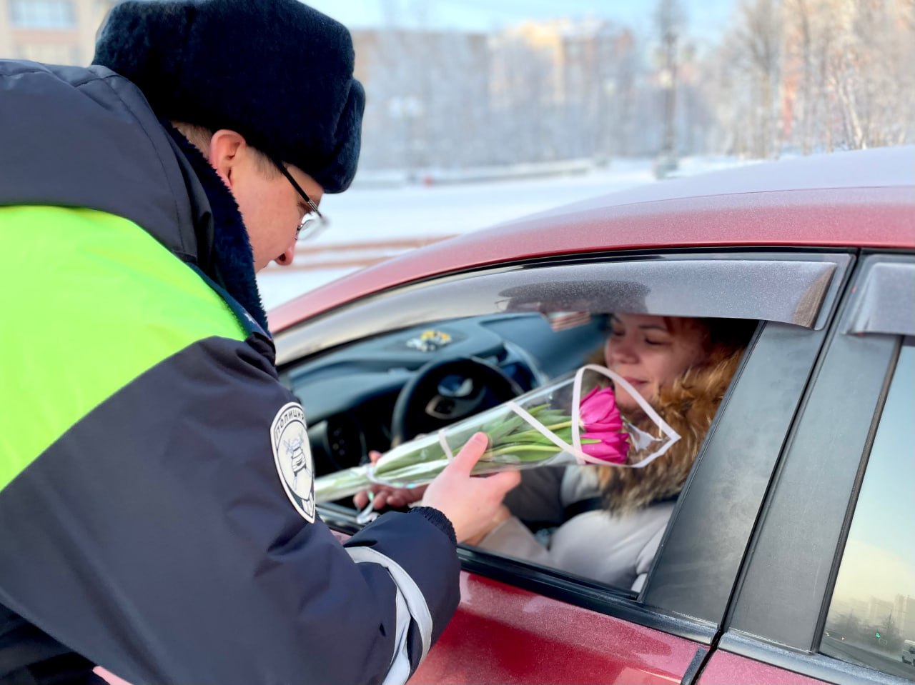 В преддверии 8 марта, символизирующего весну и женскую красоту, автоинспекторы провели акцию для автоледи. На дорогах окружной столицы полицейские останавливали женщин-водителей, чтобы поздравить их с праздником и вручить букеты тюльпанов – традиционный символ весны и внимания.