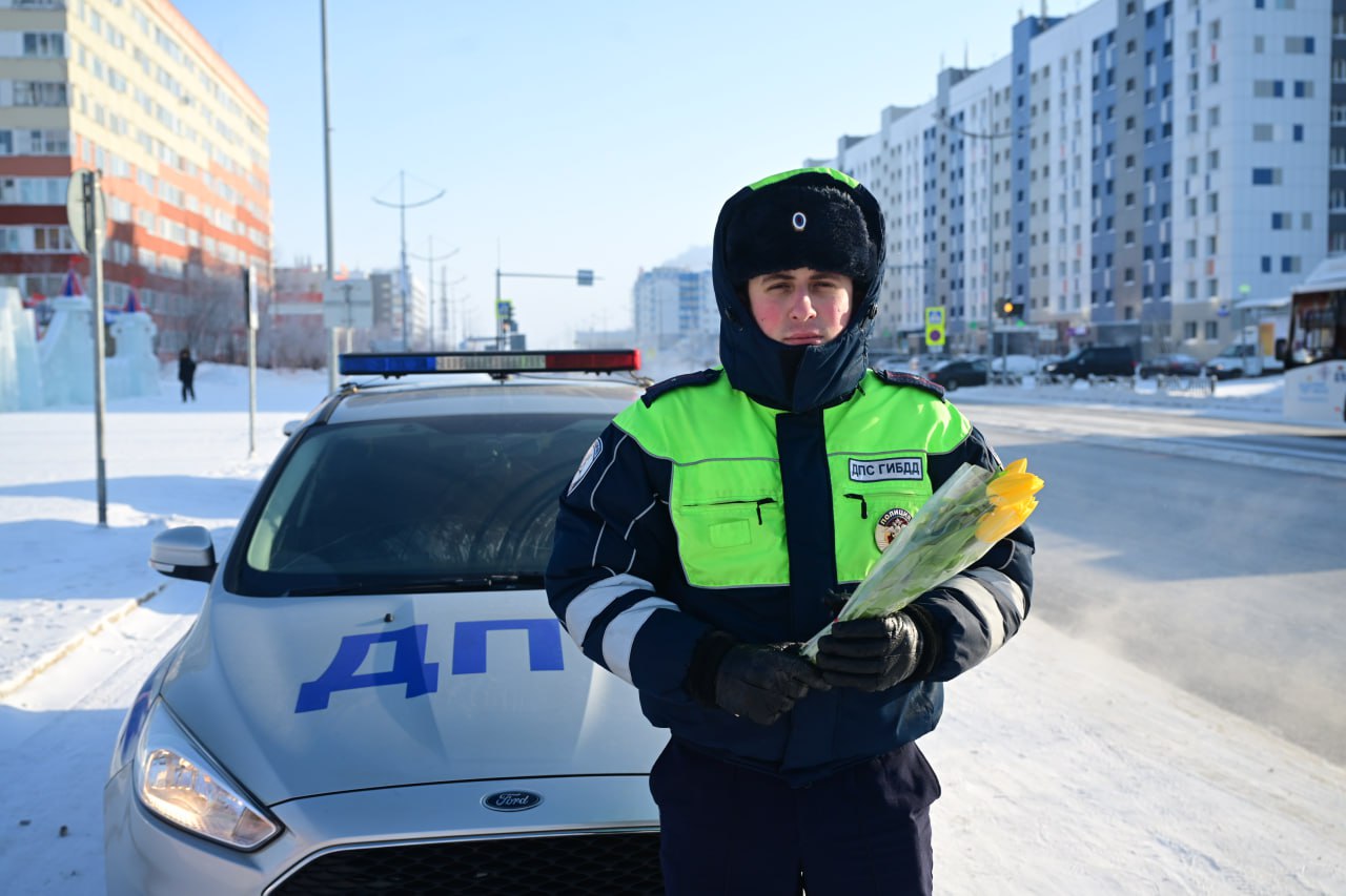 Сотрудники Новоуренгойской Госавтоинспекции поздравили автоледи с Международным женским днём!