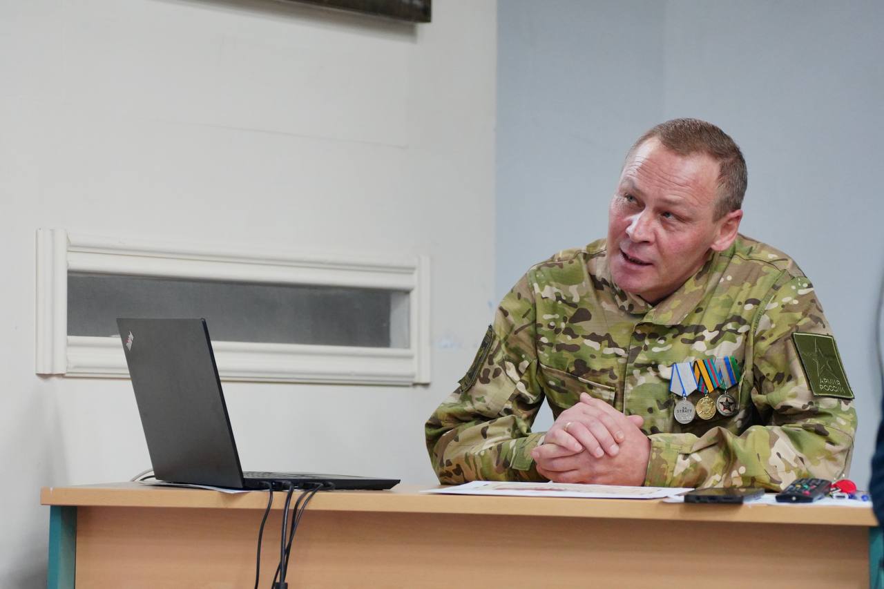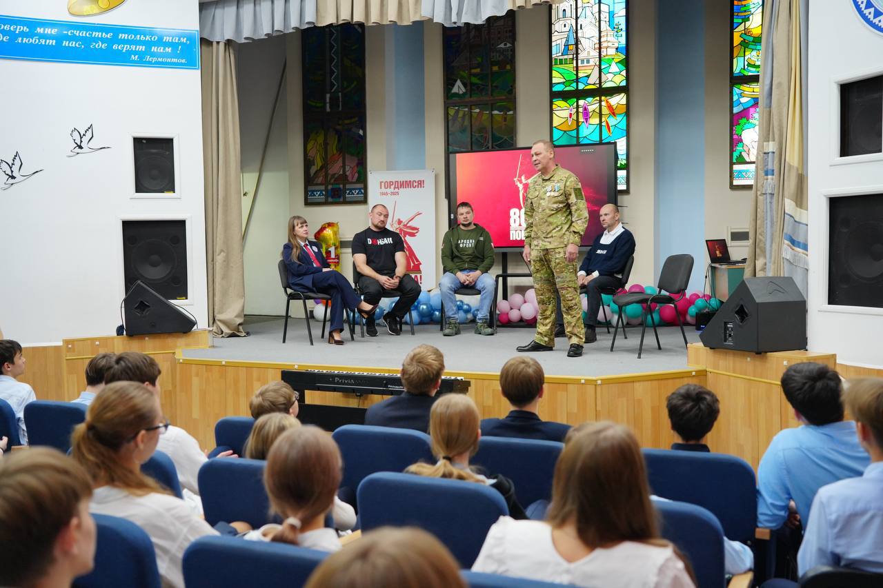 Александр Уколов поблагодарил коллектив гимназии за активную гражданскую позицию, внимание и поддержку. Он встретился со школьниками в неформальной обстановке, поделился историями о службе и рассказал о мужестве бойцов. В подарок гимназии он передал шеврон, вымпел и флаг.