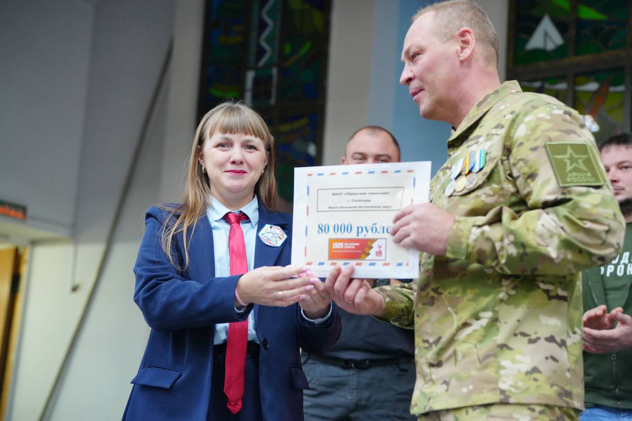 Сегодня директор Обдорской гимназии Марина Засорина передала 80 тысяч рублей председателю общественной организации ветеранов локальных войн и конфликтов, участнику СВО Александру Уколову.