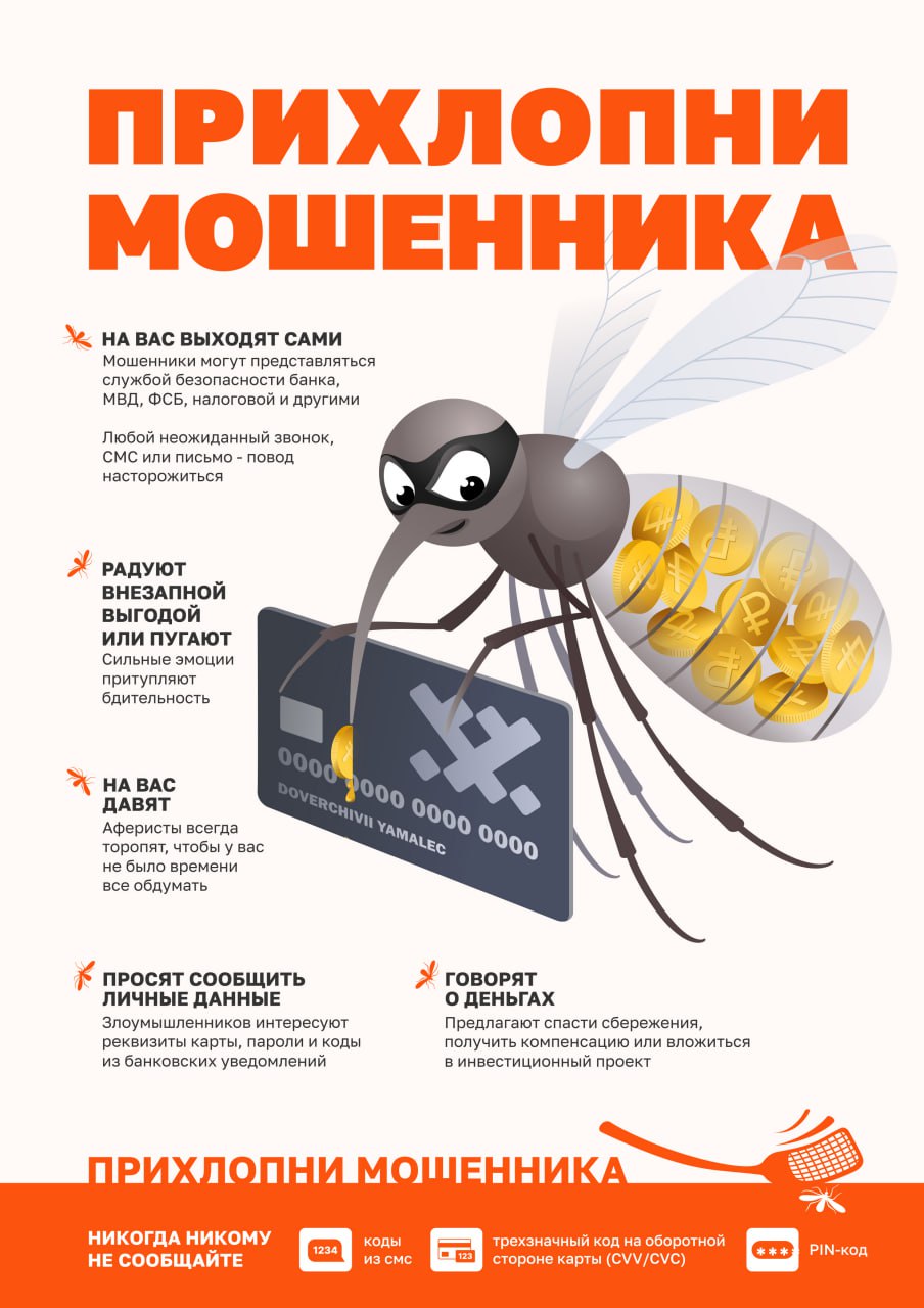 Теперь вы можете увидеть яркие памятки в общественных местах. В них — популярные схемы обмана и правила цифровой гигиены. Символом кампании выбрали северного комара, олицетворяющего мошенника-«кровопийцу», пытающегося «высосать» средства у доверчивых граждан.