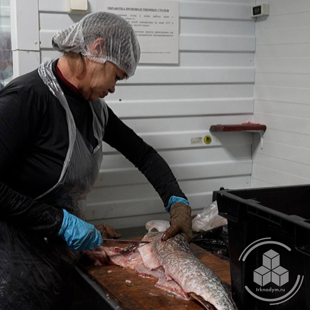 После гости побывали на экскурсии в цеху по переработке рыбы, где им показали, как обрабатывается и изготавливается местная продукция. Это вяленый чебак, чипсы из чира, копченая корюшка, фарш из щуки и многое другое.