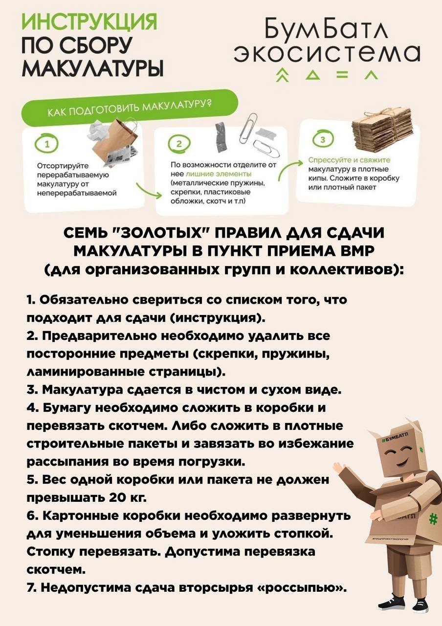 • Макулатура должна быть чистой, сухой, без ламинированных страниц, скрепок и пружин.