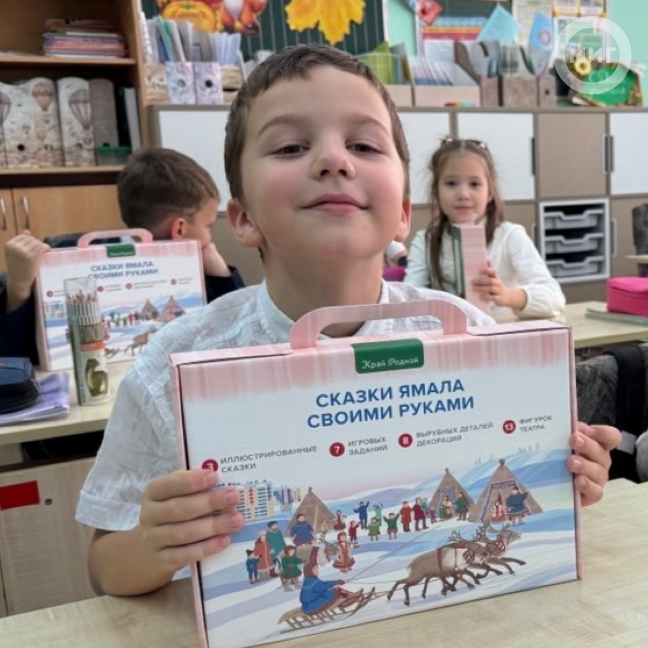 Эти памятные подарки вручили по поручению губернатора Дмитрия Артюхова. В каждом комплекте — три иллюстрированные сказки и набор для настольного театра. Они помогут первоклассникам в игровой форме познакомиться с культурой Ямала. Наборы можно будет использовать на внеурочных занятиях и для домашнего творчества.
