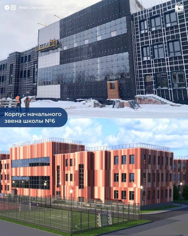 Возле школы № 6 также строится трёхэтажный учебный блок для младших классов на 500 детей площадью более 11 тысяч квадратных метров. Сейчас завершаются работы по утеплению фасада и монтажу витражных конструкций.