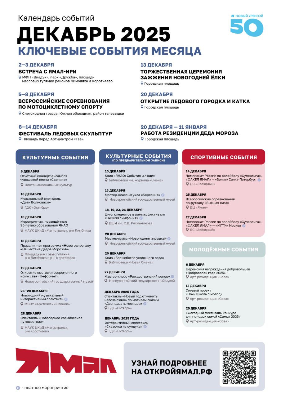 Не пропустите события последнего месяца юбилейного года — они создадут по-настоящему праздничное настроение и помогут не только провести время интересно, активно, но и погрузят в настоящую зимнюю сказку.Встреча с Ямал Ири, фестиваль ледовых скульптур, зажжение огней на главной городской ёлке, открытие катка и многое другое!