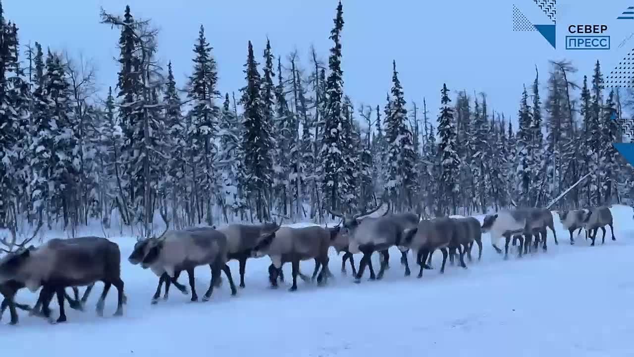 По дороге Салехард-Надым бежит многосотенное стадо оленей. Кочевники продолжают каслание на зимние пастбища.