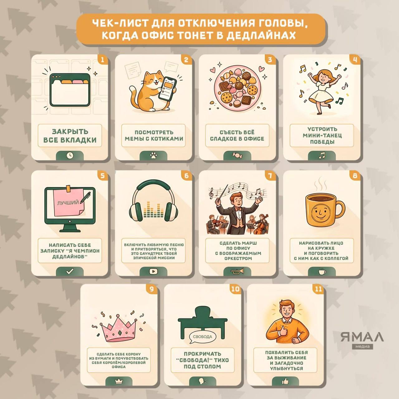 Когда наступает конец года, а офис превращается в эпицентр дедлайнов, отчётов и бесконечных писем, самое время дать себе небольшую передышку. Этот чек-лист — ваш способ выключить голову на пару минут: смотрите мемы, танцуйте, ешьте сладкое и придумывайте мини-приключения прямо за столом. Немного веселья — и рабочий день уже не кажется таким страшным!