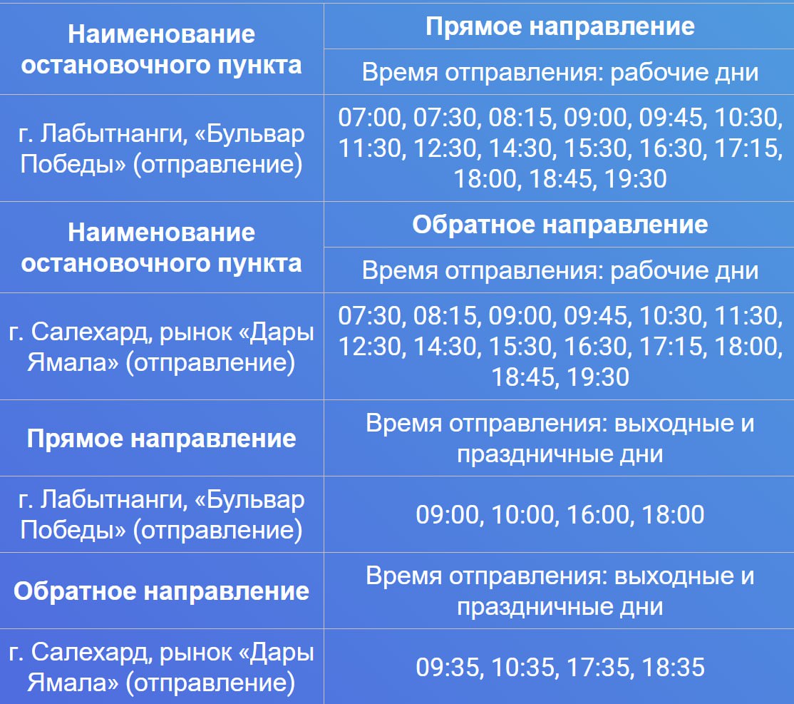 В выходные и праздничные дни количество рейсов сокращено: из Лабытнанги — четыре рейса (в 09:00, 10:00, 16:00, 18:00), из Салехарда — четыре рейса (в 09:35, 10:35, 17:35, 18:35).