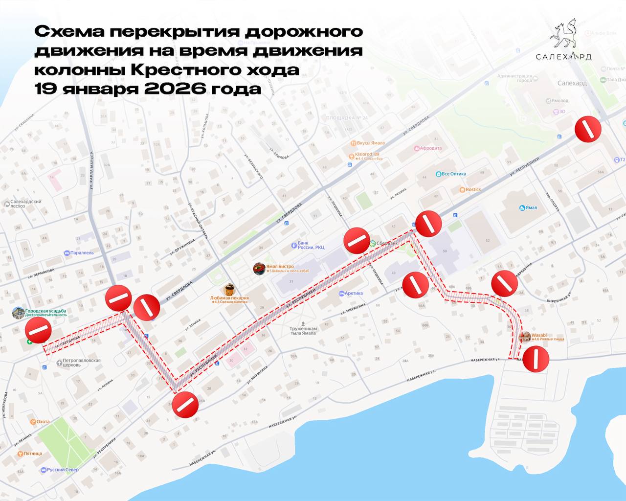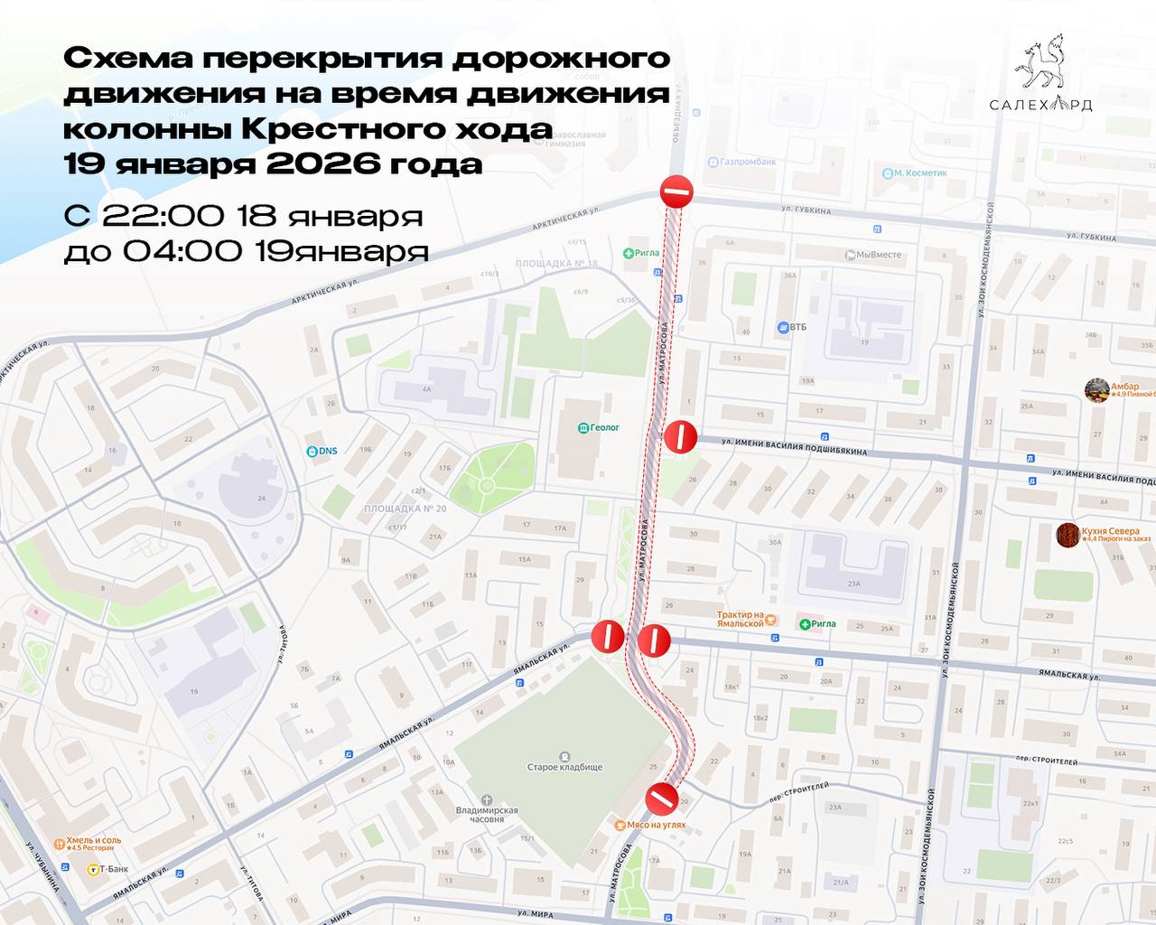 В связи с мероприятиями, посвящёнными празднованию Крещения Господня, 18-19 января, в Салехарде будут временно перекрыты отдельные участки улично-дорожной сети.