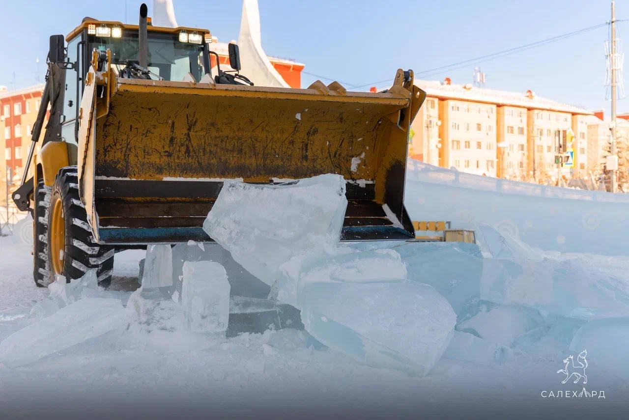 На площади у «Геолога» начался демонтаж ледяных фигур Деда Мороза и Снегурочки.