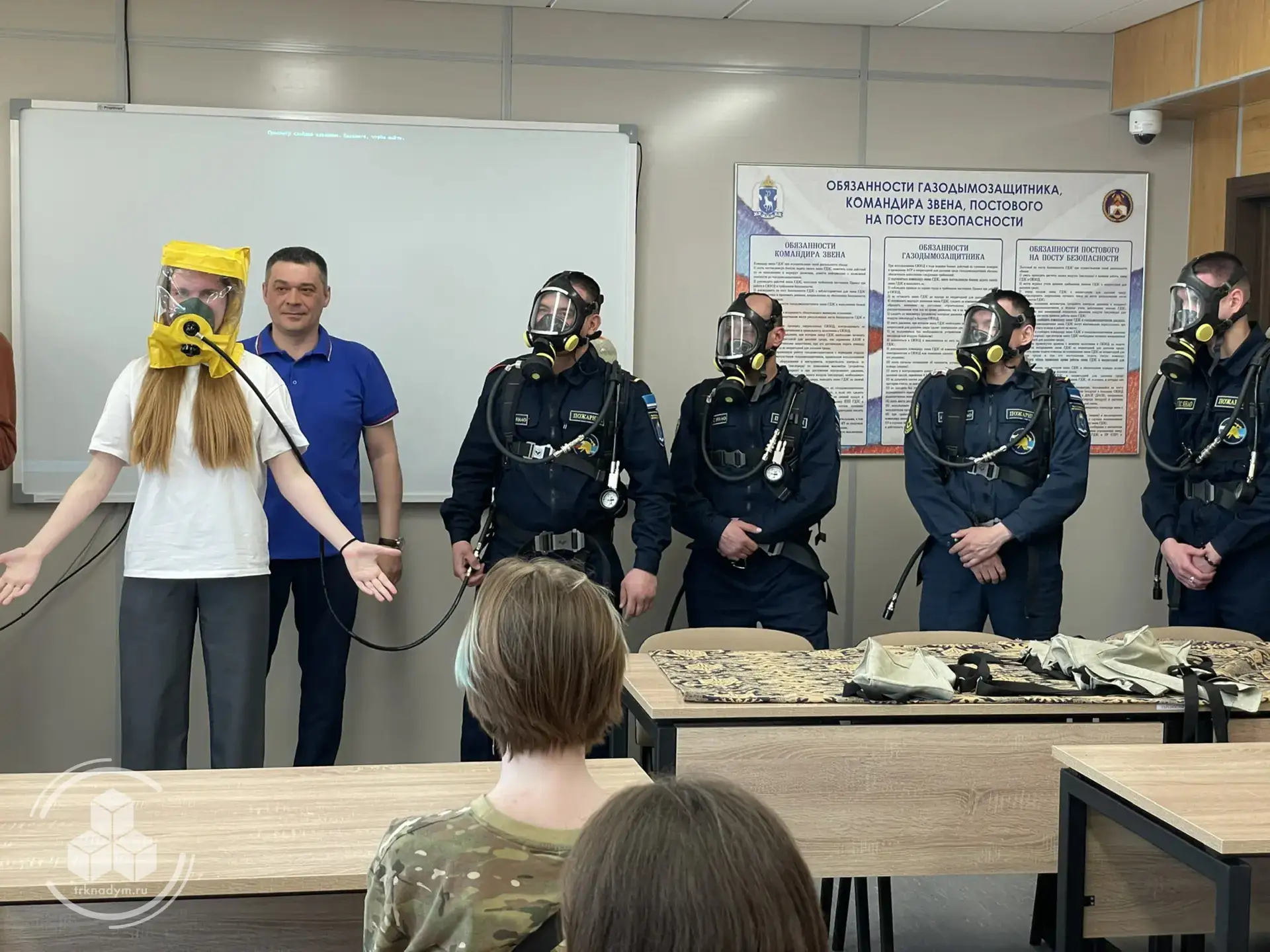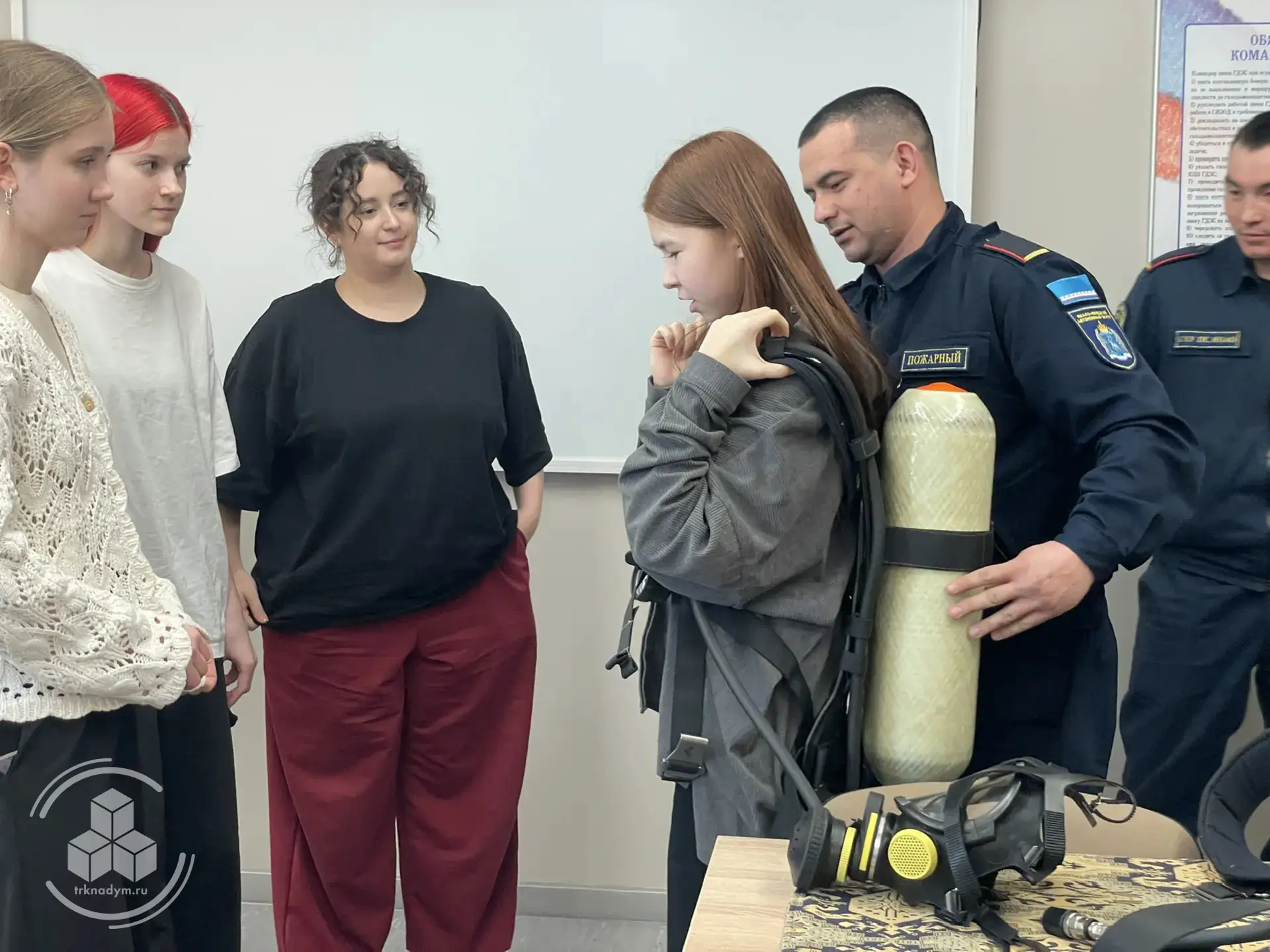 Здесь же подростки надевали на себя дыхательные системы. Это такие баллоны весом 10 килограммов. Внутри сжатый кислород, который позволяет дышать в задымлённой и газовой среде. К баллону прилагается и маска, которая защищает глаза и кожу при высоких температурах.
