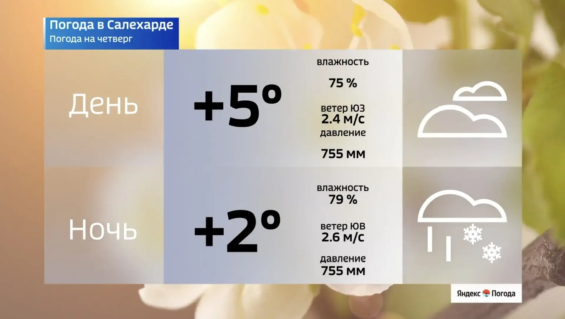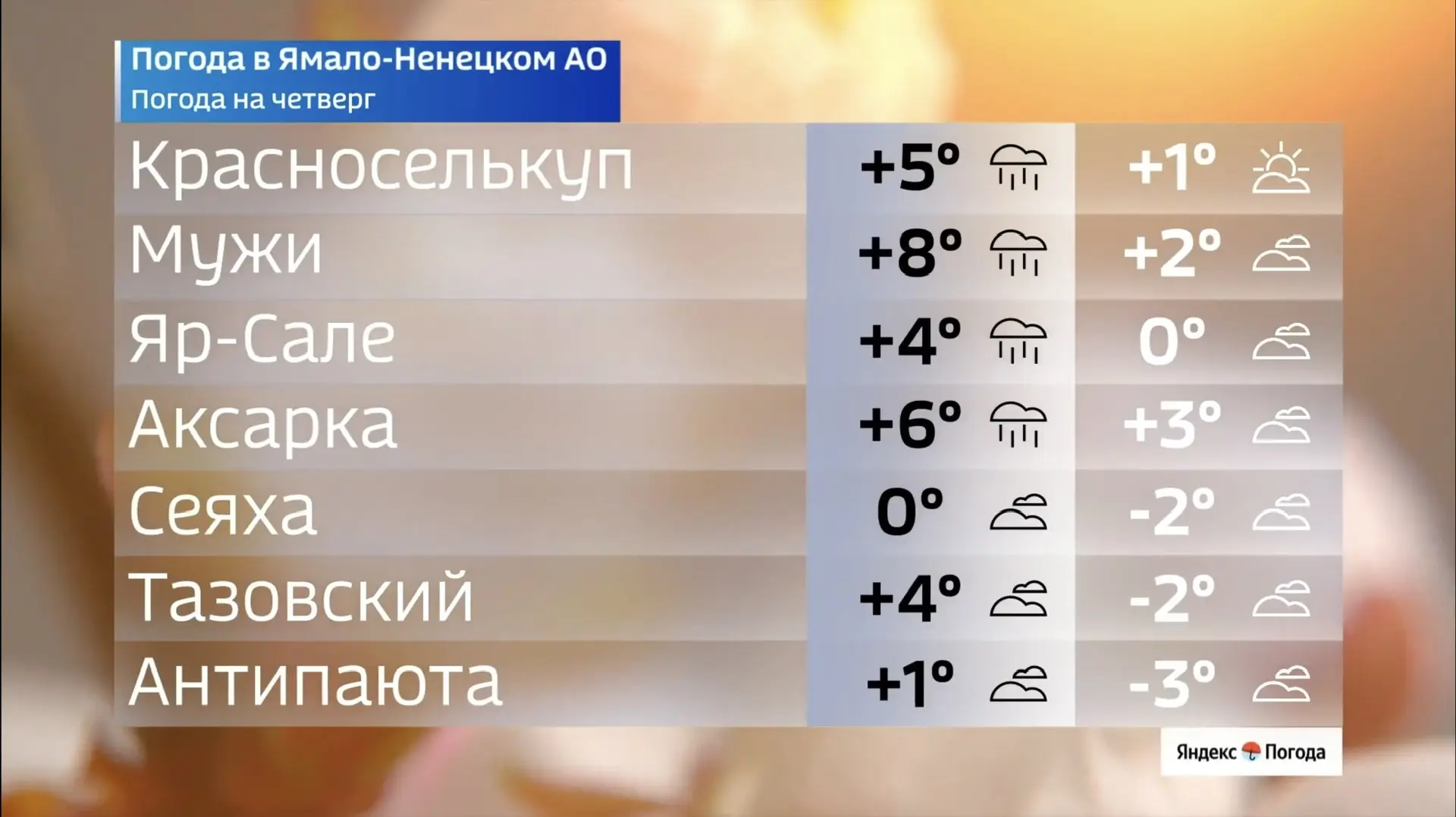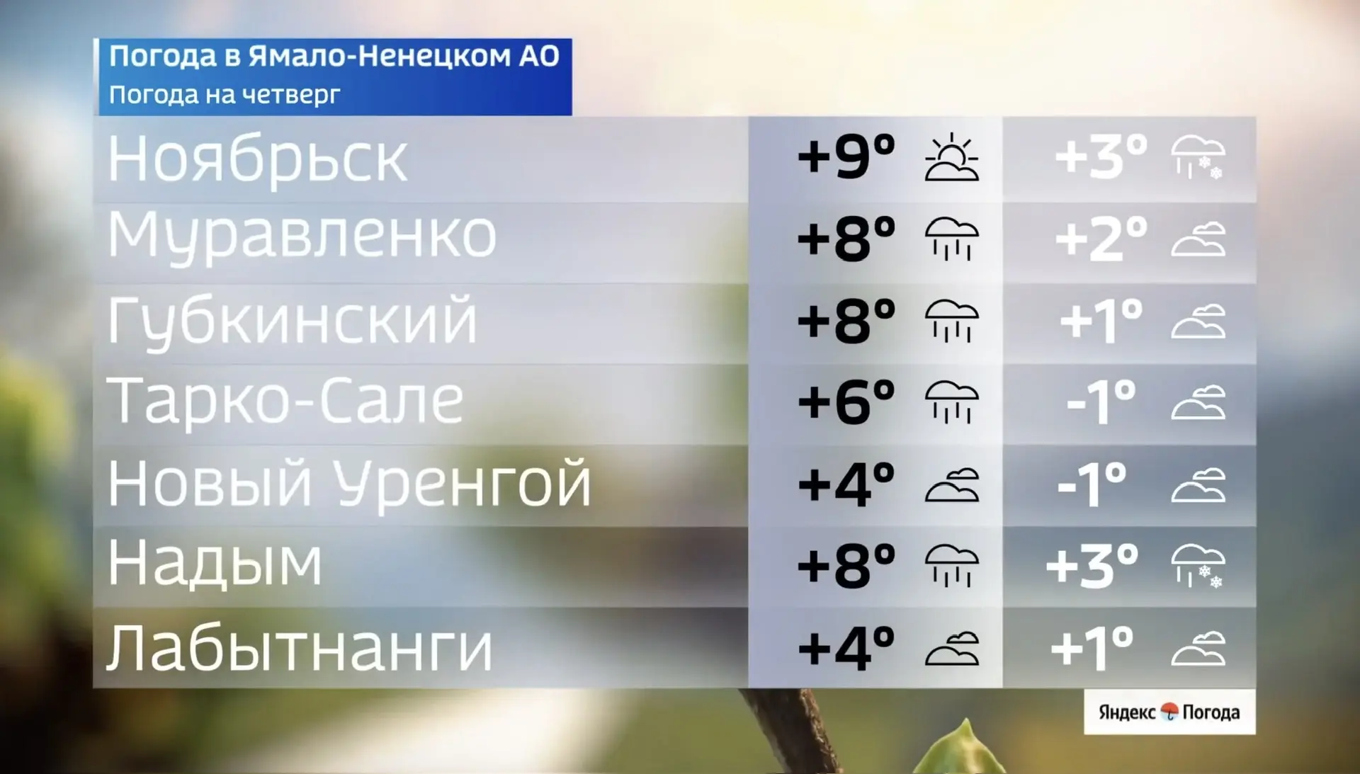 Теплее всего — в Ноябрьске, до +9°C. В Муравленко, Губкинском и Надыме воздух прогреется до +8°C, в Тарко-Сале до +6°C, в Новом Уренгое до +4°C. На севере округа прохладнее: в Красноселькупе до +5°C, в Яр-Сале и Тазовском около +4°C, в Сеяхе около 0°C.