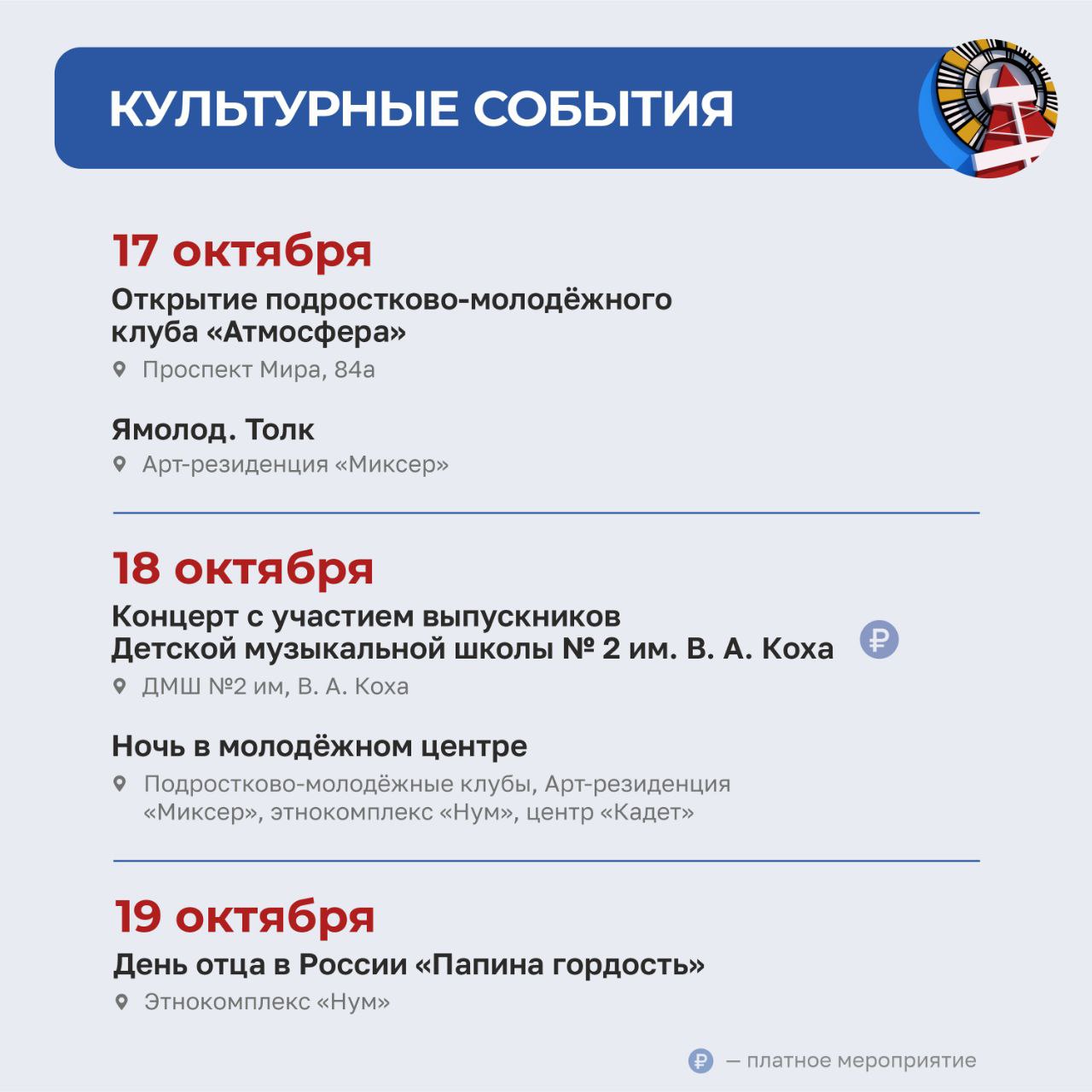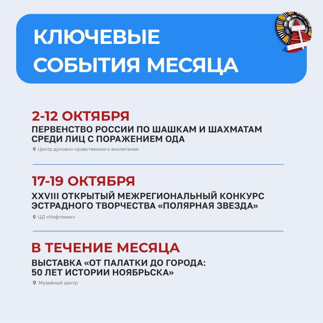 Начался октябрь, и он готов удивлять! Второй месяц осени в Ноябрьске будет насыщенным и интересным - нас ждут яркие события, встречи и незабываемые моменты.