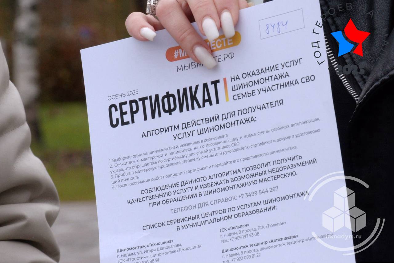 В Надыме продолжается системная поддержка семей участников специальной военной операции. Особое внимание уделяется решению бытовых проблем, с которыми женщины сталкиваются в отсутствие мужей. Дважды в год - перед началом зимы и лета - семьи военнослужащих получают специальные сертификаты на шиномонтажные услуги.