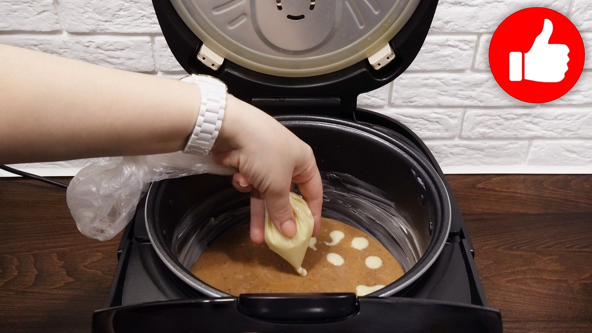 Теперь можно переходить к финальной части. В смазанную маслом чашу мультиварки выливают основное тесто, а сверху аккуратно добавляют светлое тесто, оставляя капельки на темном фоне. Включите режим «Выпечка/Мультиповар 130°C» и готовьте кекс в течение 60 минут. Для некоторых мультиварок время выпечки может быть сокращено до 45 минут.