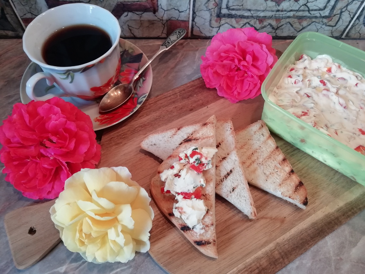 На следующем этапе готовится ароматная смесь. Базилик шинкуется мелко, сушеный лук измельчается в блендере, а вяленые помидоры и запеченный перец нарезаются на небольшие кубики. Размягченное сливочное масло помещается в подходящую миску, к нему добавляются все подготовленные ингредиенты, тщательно перемешиваются и подсаливаются по вкусу.
