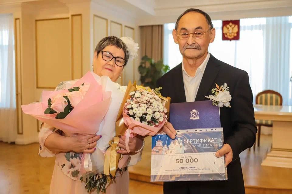 Юбиляров поздравил первый заместитель главы администрации города Андрей Барышников, который вручил им приветственный адрес и памятный подарок. Также от губернатора ЯНАО Садыковым был вручен сертификат "Семье Ямала" на сумму, равную количеству лет, прожитых вместе.