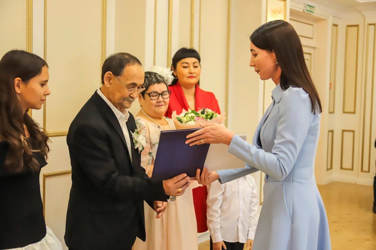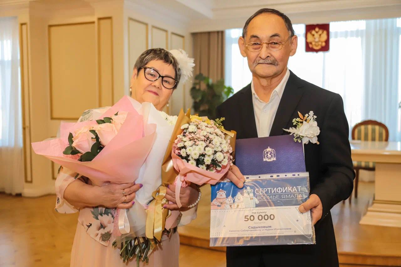 Сегодня в ЗАГСе состоялась торжественная церемония, на которой поздравили юбиляров — Камиля Сабирчановича и Нурию Измайловну Садыковых. Их история началась 50 лет назад, летом 1975 года, когда они встретились на танцах в горсаду. Нурия пришла с подругой детства Зиной, которая уже была замужем за другом Камиля. Будущий жених заметил интересную девушку и подошёл для знакомства.