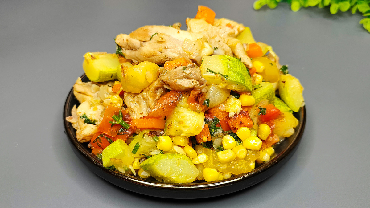 В финале добавляются зеленый горошек или кукуруза и свежая зелень. После добавления соли и перца, рагу оставляют томиться еще 15 минут — и вот оно, настоящая вкуснятина!