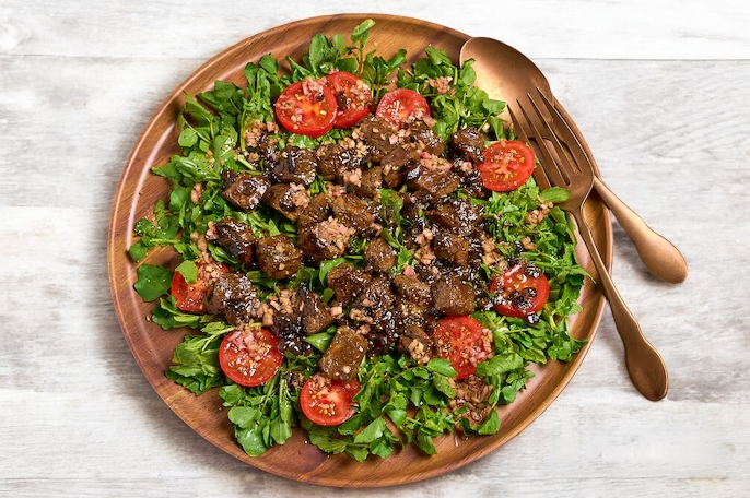 После обжаривания говядины добавьте в сковороду лук и готовьте, пока он не станет полупрозрачным, затем верните мясо и добавьте заранее приготовленный маринад, чтобы создать вкусный соус. Подавайте блюдо с кресс-салатом и помидорами, предварительно полив их оливковым маслом и приправив маринованным луком. Это блюдо несомненно станет звездой вашего стола в наступающем году!