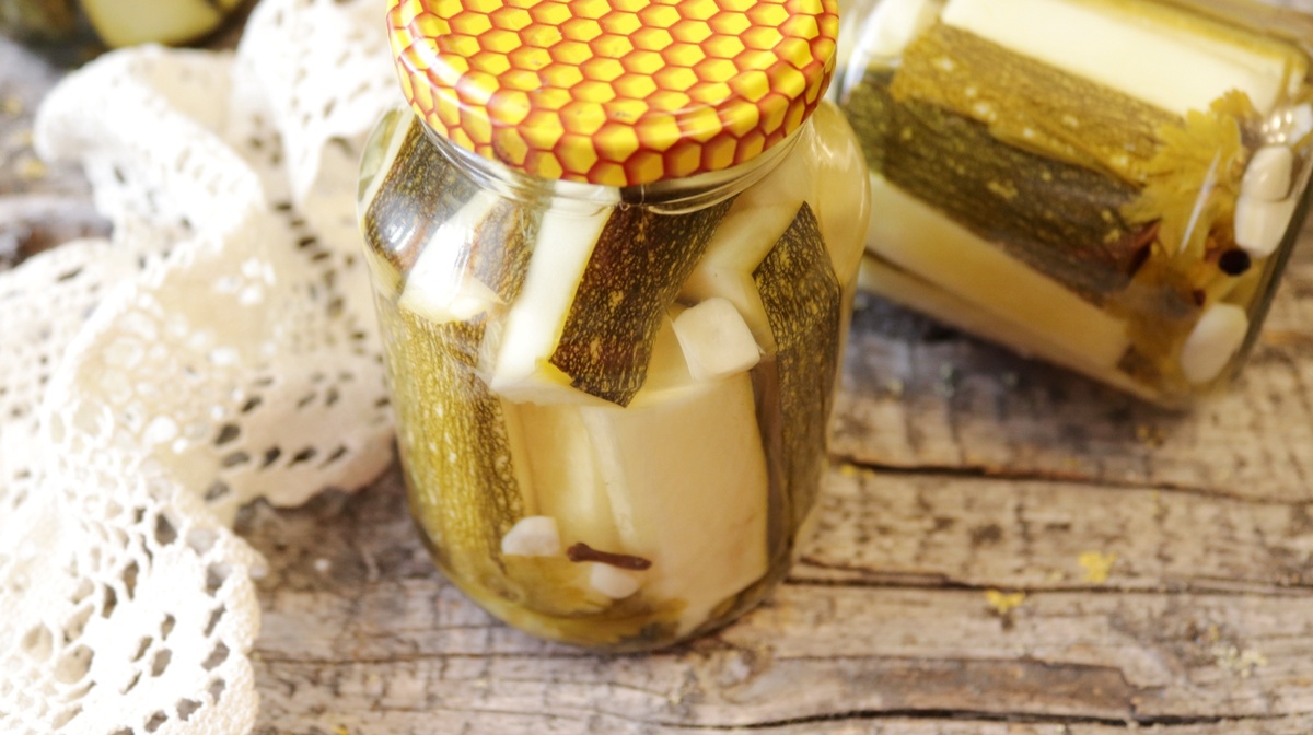 На дно стерилизованной банки укладываются гвоздика, перец и порезанный чеснок. Слегка нарезанные кабачки укладываются в банку способом, чтобы не было переизбытка воздуха и чтобы они не были слишком упакованы.