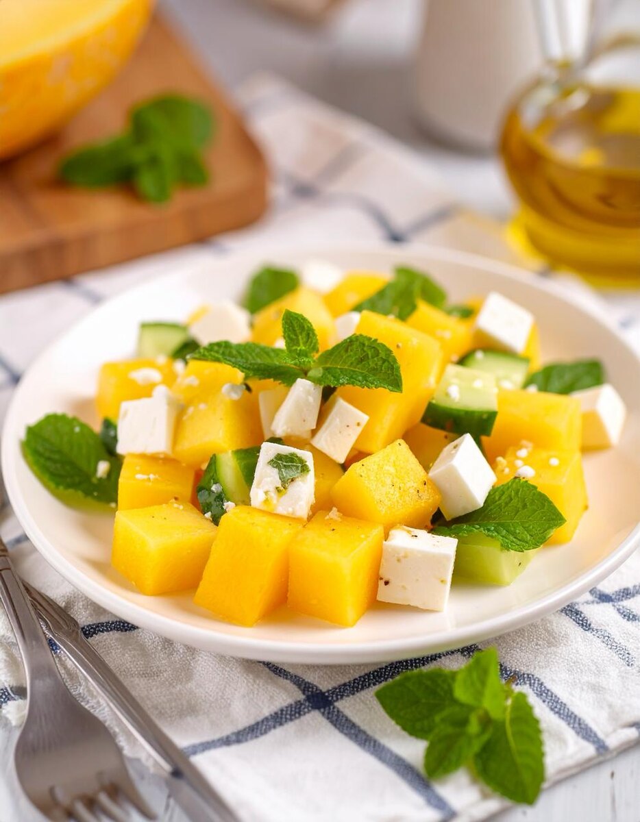 Этот салат радует сочетанием сладости дыни и солоноватости феты, придавая свежесть огурца. Это прекрасный способ продлить летние ощущения даже в начале осени!