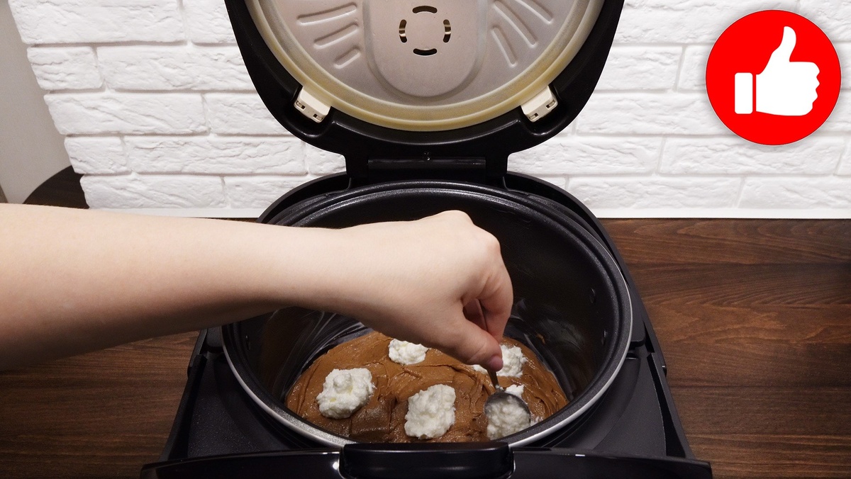 Сначала следует тщательно смешать творог с сахаром, используя погружной блендер для достижения однородной массы. Затем яйца нужно взбить с сахаром, используя миксер, и добавить мягкое сливочное масло вместе с молоком. Пора добавить муку, какао и разрыхлитель. В результате получится воздушное тесто, которым можно начинать заполнять мультиварку.