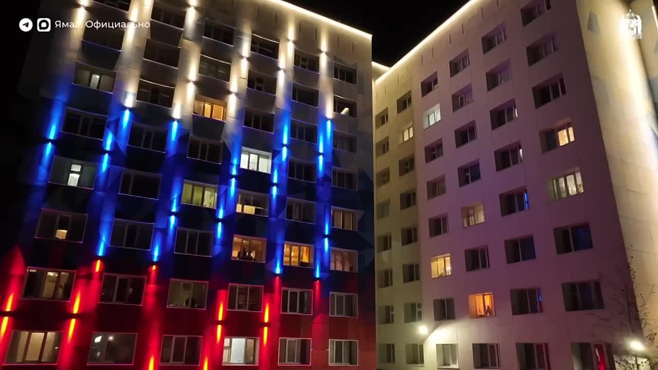 Фасад здания на проспекте Мира, 80 выполнен в цветах российского триколора. Для этого был разработан специальный паттерн, который создаёт эффект мозаики. Вечером дом украшает подсветка. Над проектом работали специалисты из Ноябрьска и архитектурного бюро Pergaev Bureau.
