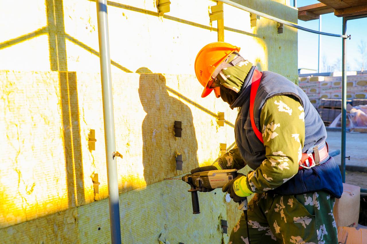 Сейчас выполняются фасадные работы: рабочие занимаются устройством теплоизоляции и монтажом облицовки. Параллельно идет черновая отделка внутри, благоустройство дворовых территорий.