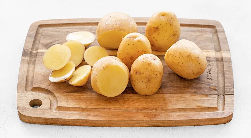Приступая к приготовлению, важно правильно подготовить картофель. Если используются старые клубни, их необходимо очистить; для молодых достаточно промыть под проточной водой с использованием щетки. Чтобы картошки было проще размещать на противне, следует срезать часть клубней с одной стороны, сделав их устойчивыми.