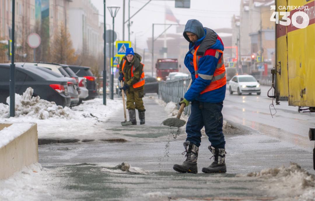 В Салехарде усилены меры безопасности в связи с гололедицей: за три дня израсходовали на обработку объём противогололёдного материала, равный объёму 15 самосвалов
