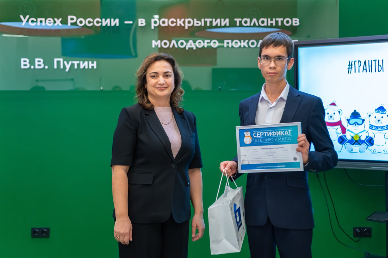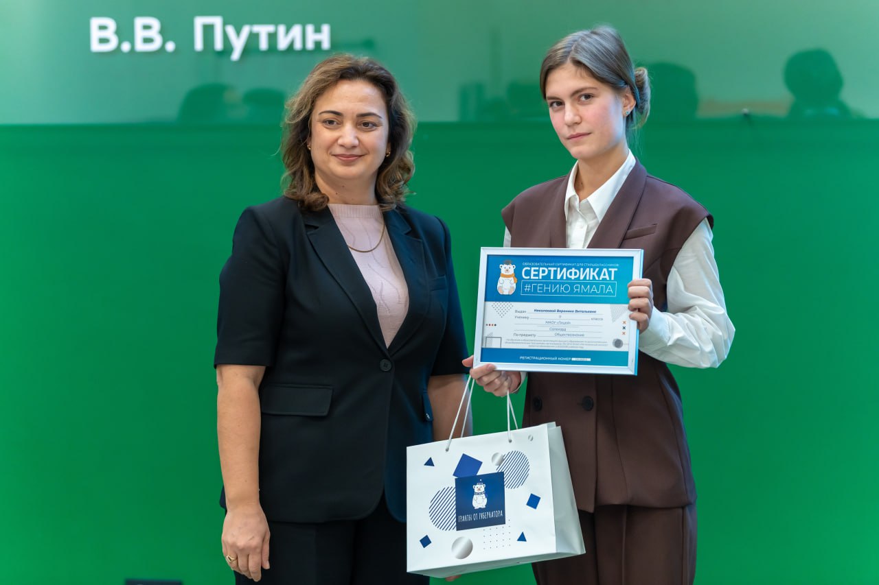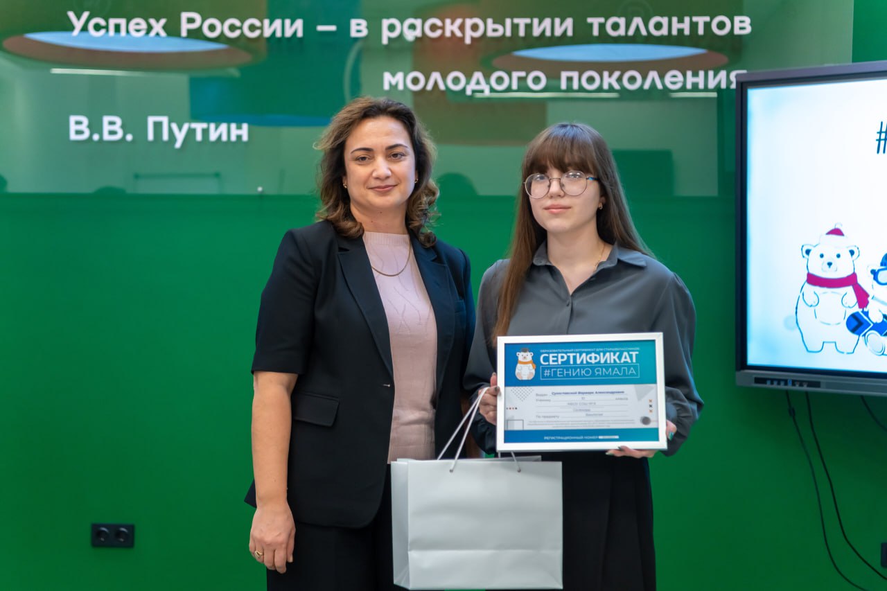 Сегодня юная жительница нашего города и еще 10 лицеистов стали обладателями сертификата «Гений Ямала». Образовательный проект для старшеклассников реализуется на протяжении пяти лет при поддержке губернатора нашего округа Дмитрия Артюхова. Благодаря чему талантливые ученики получают возможность пройти профильное обучение в лучших вузах страны. Сертификатами поощряют старшеклассников за успехи по разным предметам — математике, физике, информатике, обществознанию и другим.