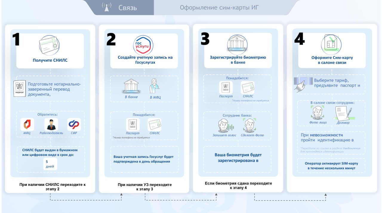 Подробную инструкцию по оформлению SIM-карты для иностранного гражданина смотрите в нашей карточке.