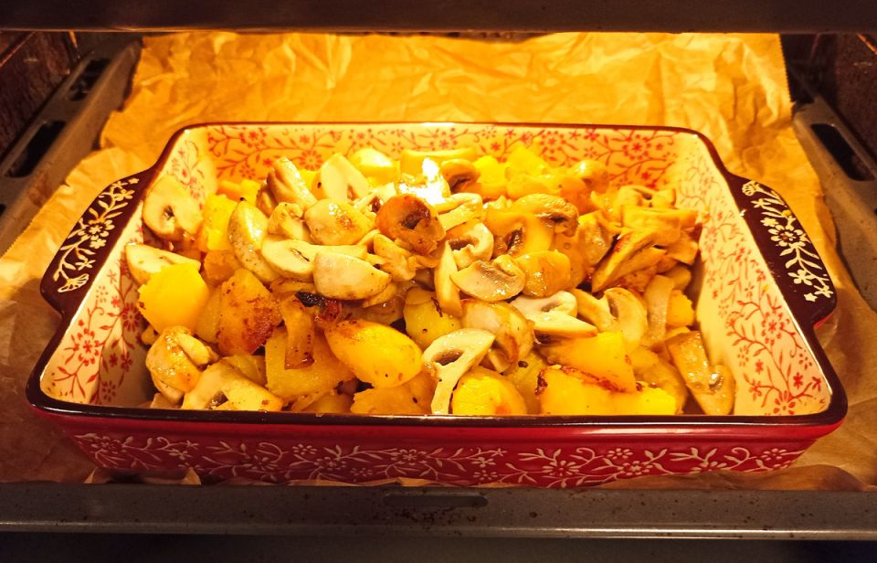 Овощи следует предварительно очистить, а картошку нарезать крупными кубиками. Лук и грибы можно нарезать средними кусочками. Все ингредиенты следует смешать, добавить специи и заправить растительным маслом. Затем переложить в противень и запекать около 30-40 минут при температуре 180°C. Это блюдо станет настоящим украшением вашего постного стола.
