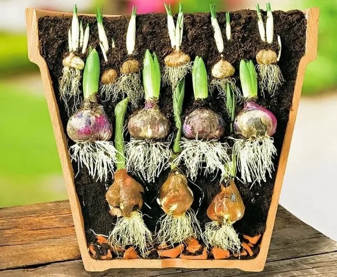 Идея посадки луковичных цветов, как в лазанье, заключается в расположении луковиц различных растений в один горшок на разных уровнях. Сначала врывают самые глубокие луковицы, которые цветут позже, затем поэтапно добавляются более ранние варианты. Это дает возможность создать удивительную цветочную композицию, которая будет свести в разные промежутки времени.