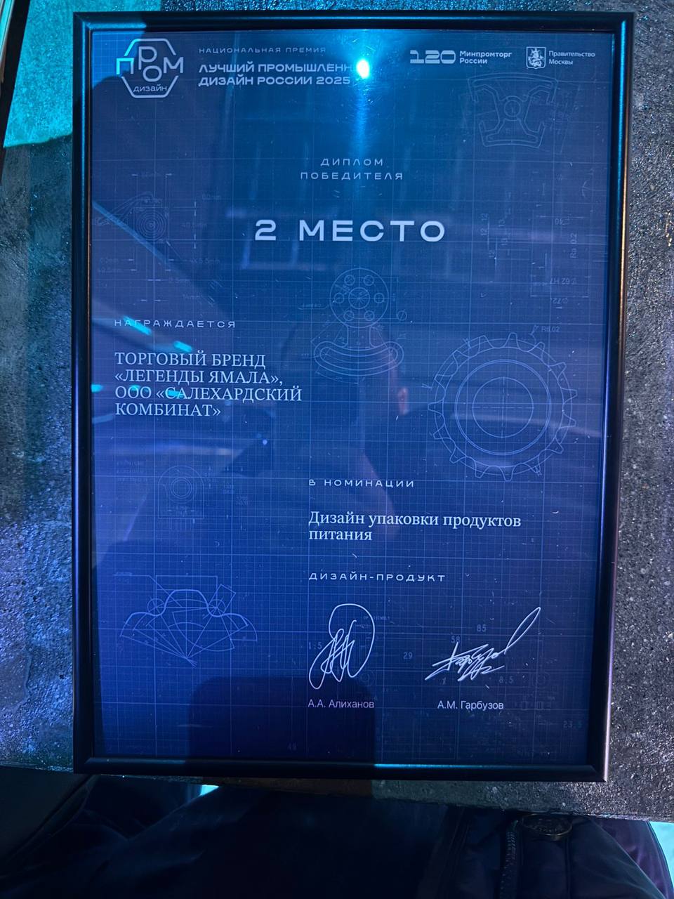 ООО «Салехардский комбинат» занял второе место в престижной национальной премии «Лучший промышленный дизайн России» в категории «Дизайн упаковки продуктов питания». Эта премия проводится в России в третий раз, организаторами выступают Правительство Москвы и Министерство промышленности и торговли РФ. В этом году на конкурс было подано более ста тысяч заявок, а победителей выбирали из 200 финалистов, вошедших в шорт-лист.