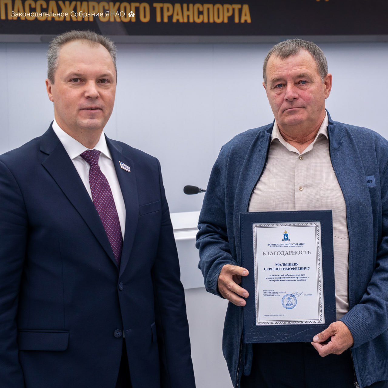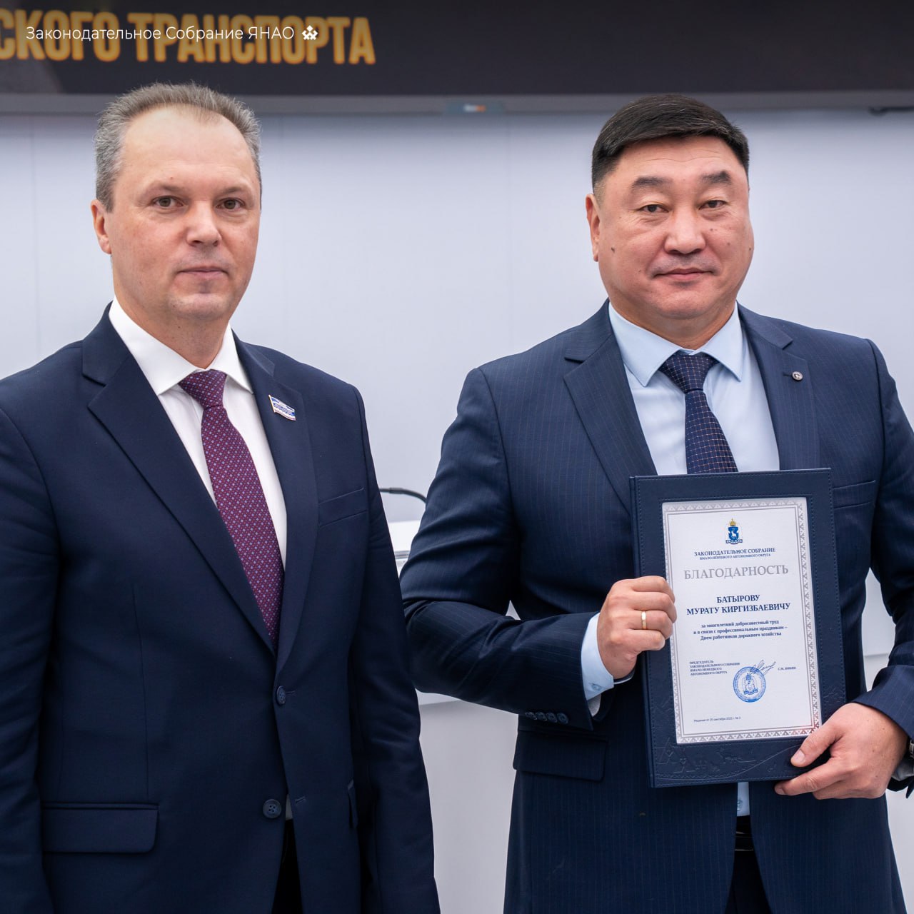 Председатель комитета по экологии, промышленности, АПК и делам КМНС Иван Сакал вручил награды заксобрания ямальским работникам дорожного хозяйства