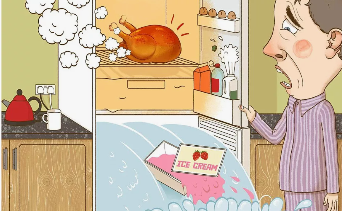 Когда горячие продукты попадают в холодильник, система начинает работать на пределе своих возможностей, чтобы компенсировать поступающее тепло. Это похоже на работу кондиционера, который включают на полную мощность при открытой двери, ведущей в горячую комнату.