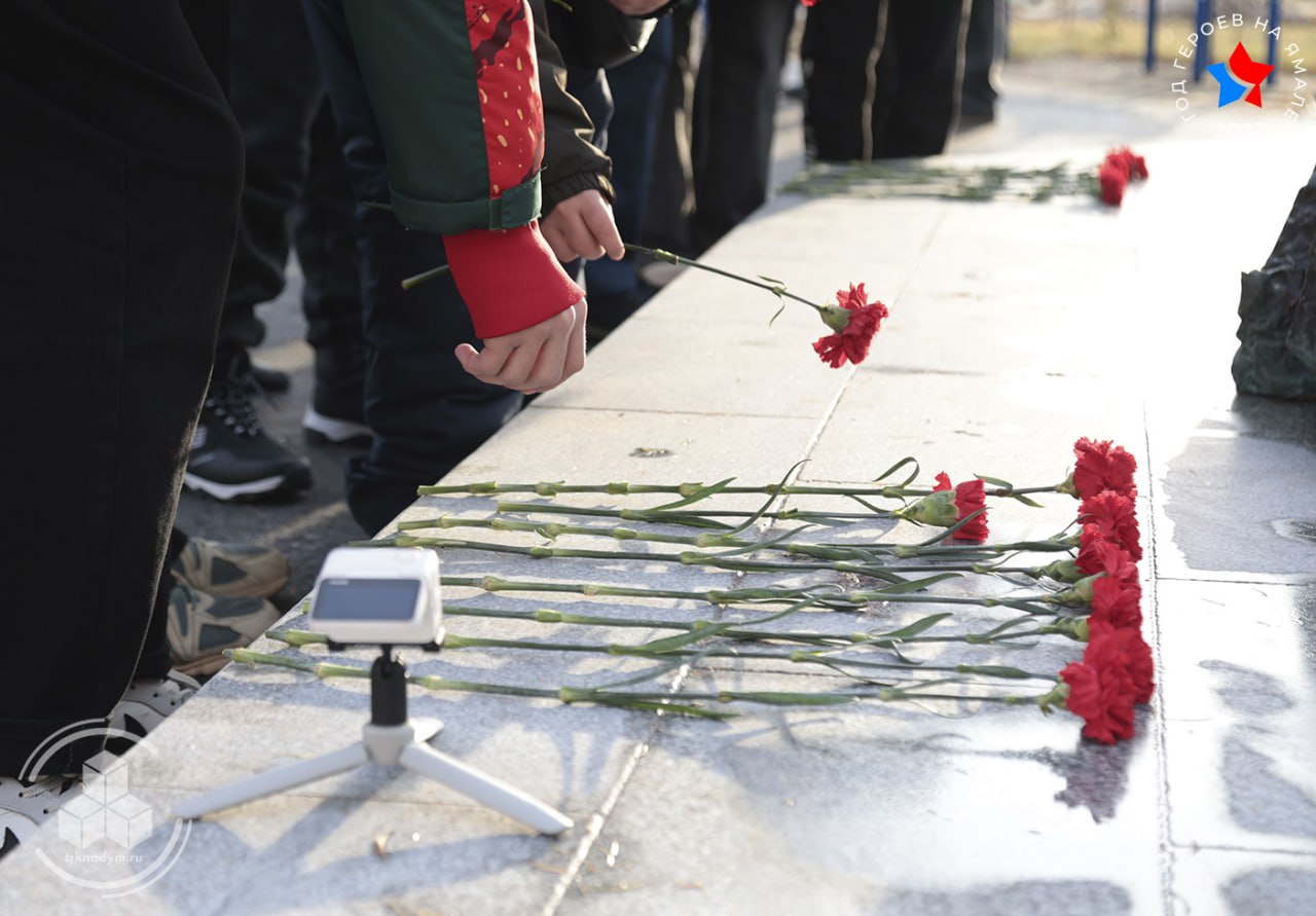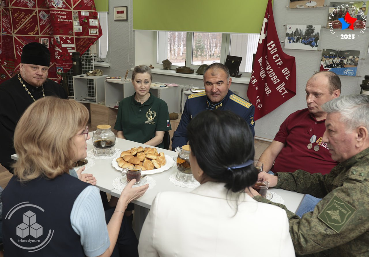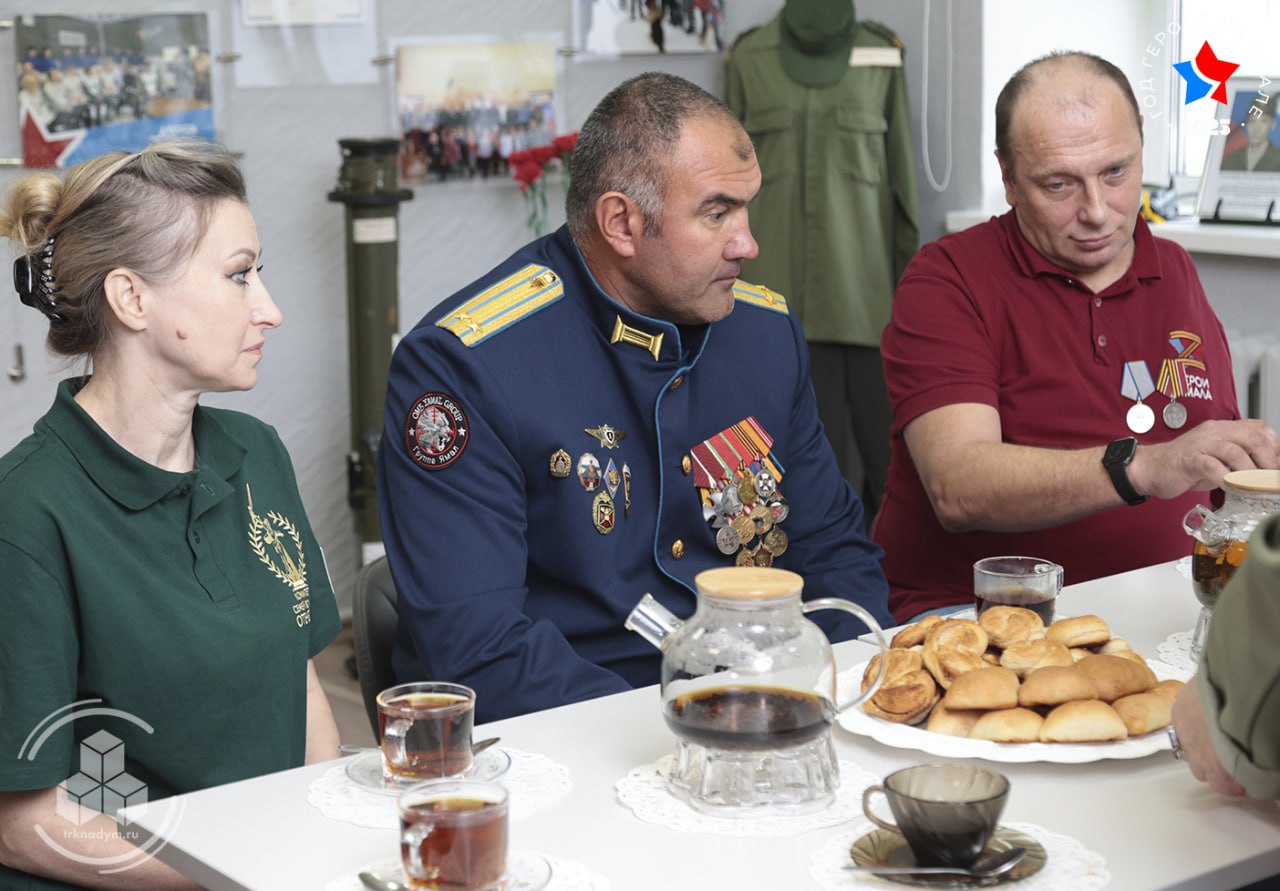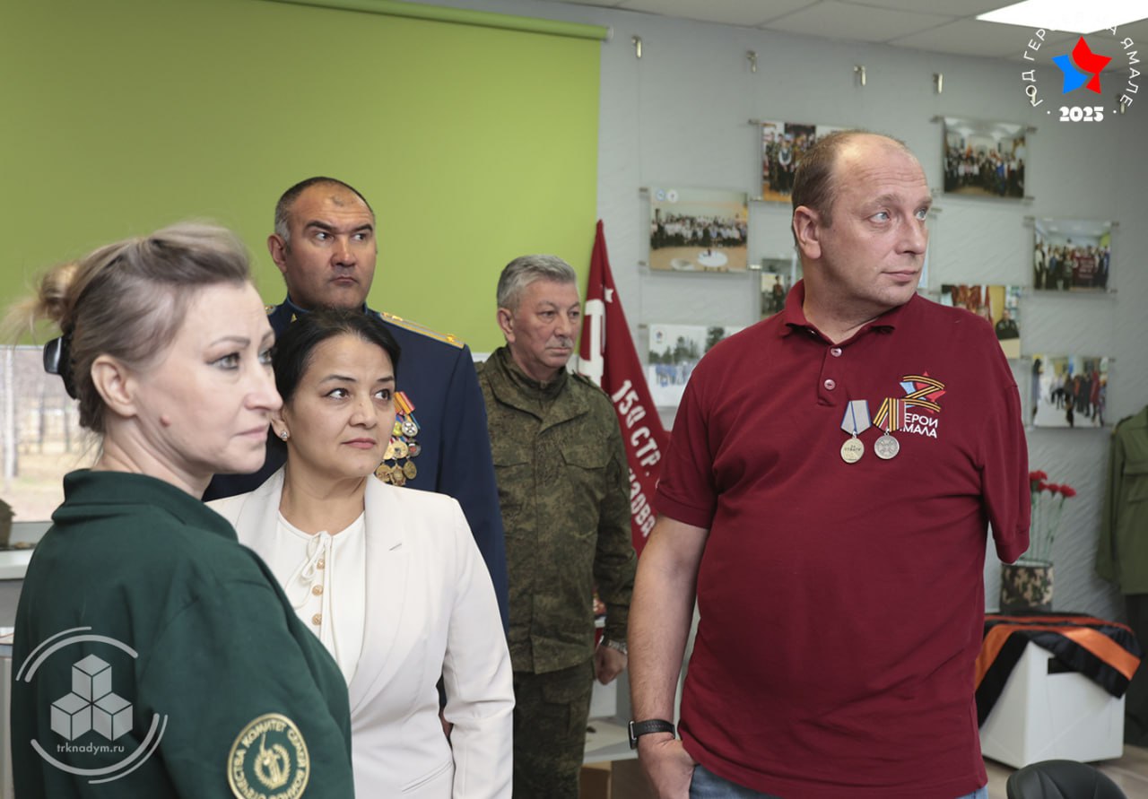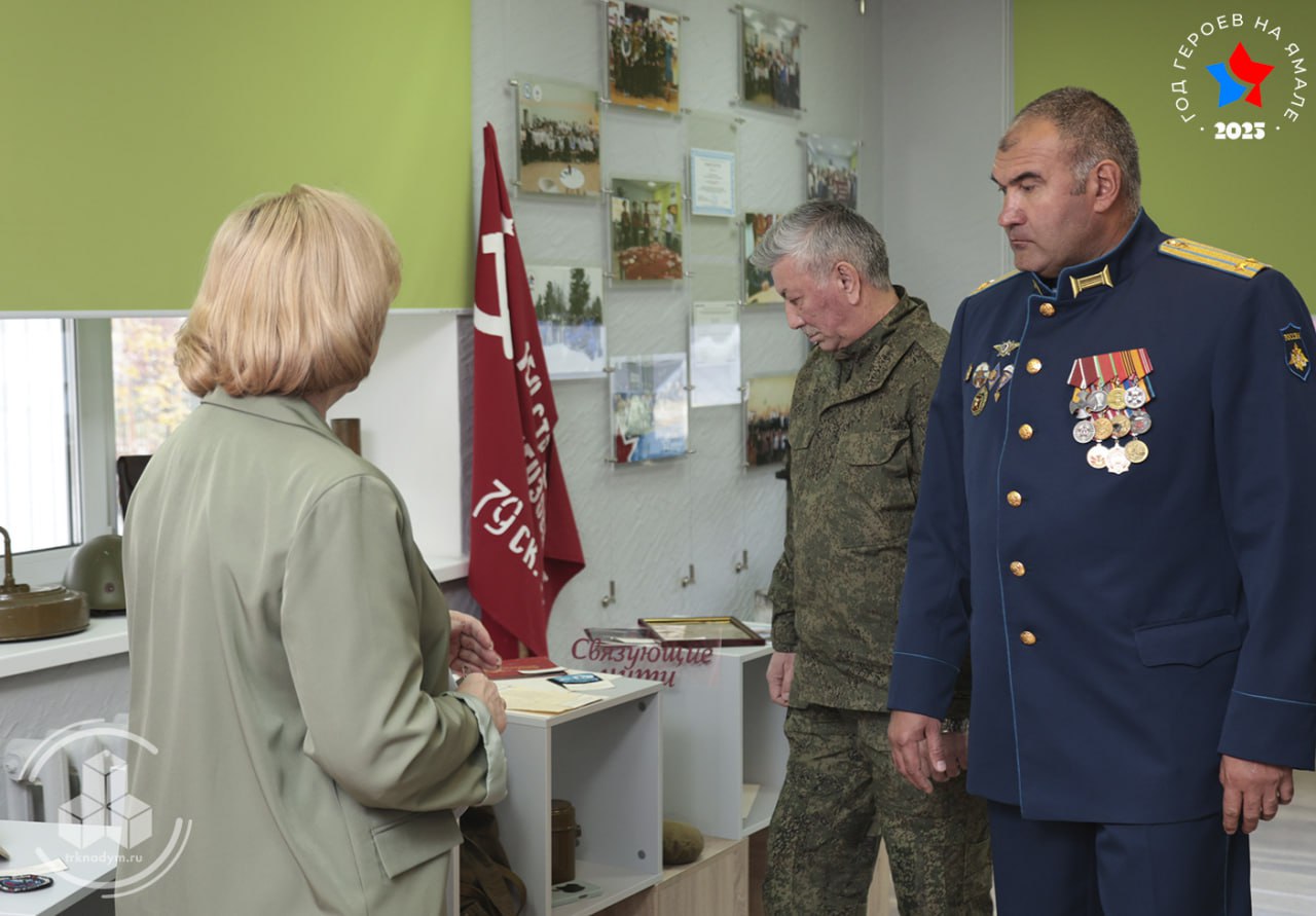 В музее СОШ №4 состоялась встреча участника специальной военной операции Дмитрия Клишева с военным комиссаром Надымского района Уралом Хисматуллиным, заместителем главы районной администрации Ириной Трухановой, участниками проекта «Герои Ямала» и отцом Артемием