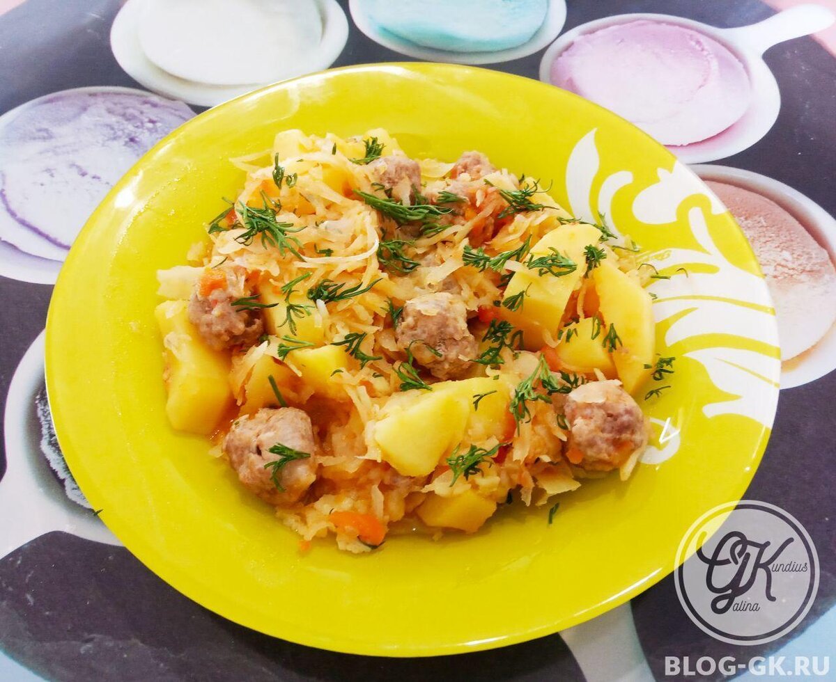 Шарики аккуратно помещаем в рагу и варим несколько минут, затем добавляем капусту и картофель. Важно, чтобы картофель не был полностью покрыт жидкостью, иначе рагу станет слишком жидким. Готовим на медленном огне до полной готовности, добавляя соль и перец по вкусу в конце готовки.