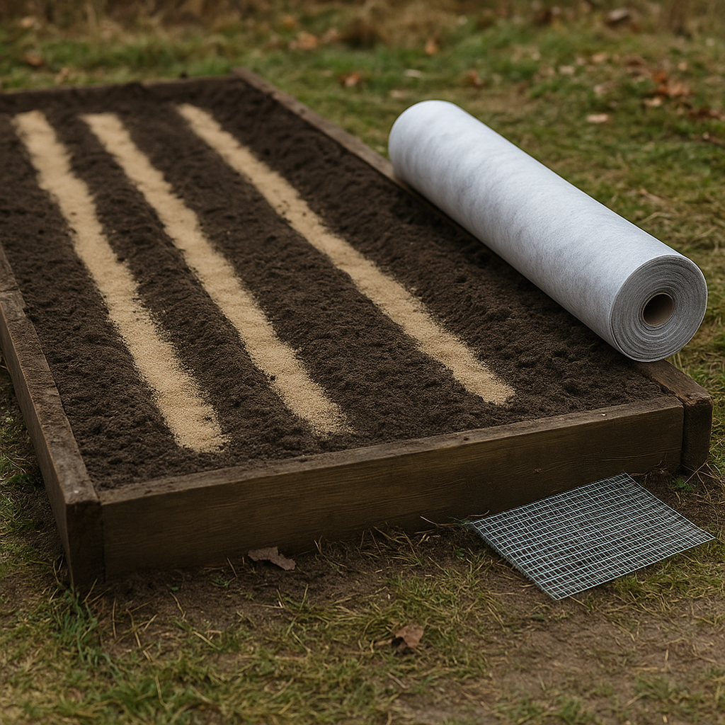 - Вертикальный периметр: Вокруг грядки вырывается узкая траншея глубиной 35–40 см, куда вставляется сетка, загибая нижний край наружу. Это создаст «корзину», защищая корни моркови от кротов, которые могут подтачивать землю снизу.